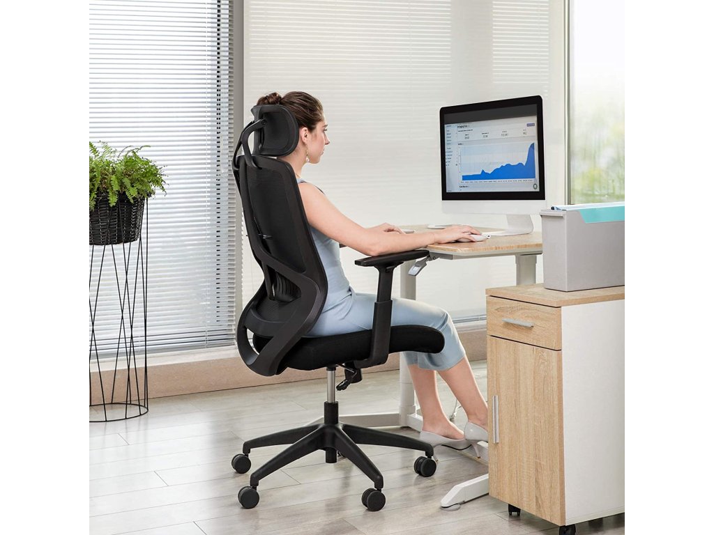Pohodlné kancelárske kreslo s opierkou hlavy, ergonomicky tvarovaným sedadlom a nastaviteľnou bedrovou opierkou. Ideálne pre dlhé hodiny práce v kancelárii.