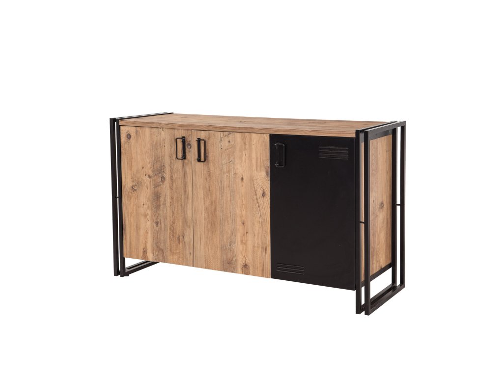 Komoda COSMO Nora má sedem priehradiek. Štyri sú ukryté za dvojitými dverami a tri za bočnými dverami. Dokonale zapadne do interiéru v industriálnom štýle. Komoda je vyrobená v saténovej borovicovej farbe a čiernej farbe.
