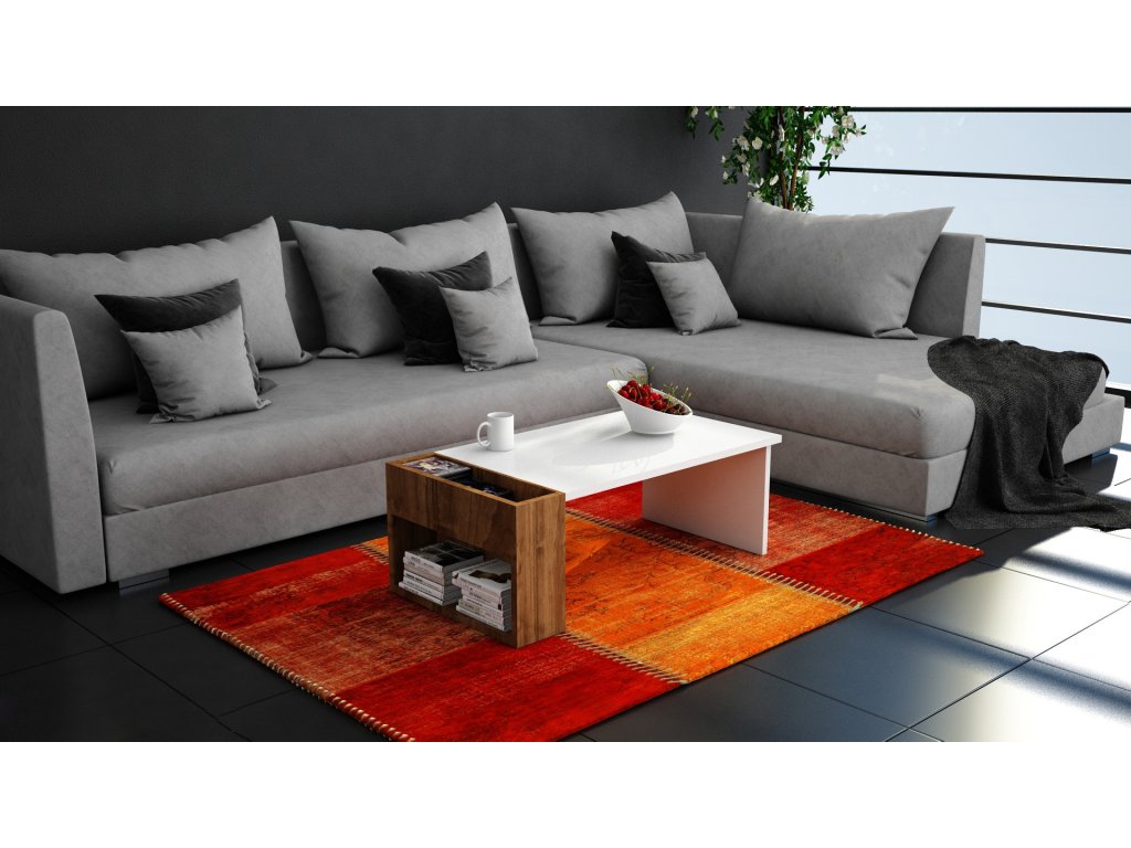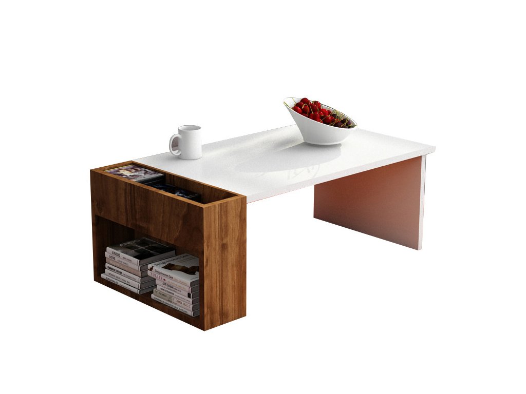 Konferenčný stolík VIEW je vlastne úplne jednoduchý biely stolík, ku ktorému je z boku upevnený malý regál s otvorenou priehradkou v dekore orech.
