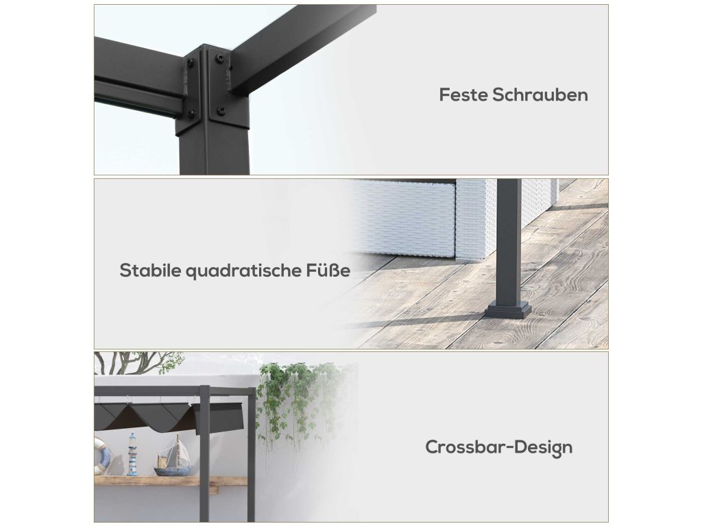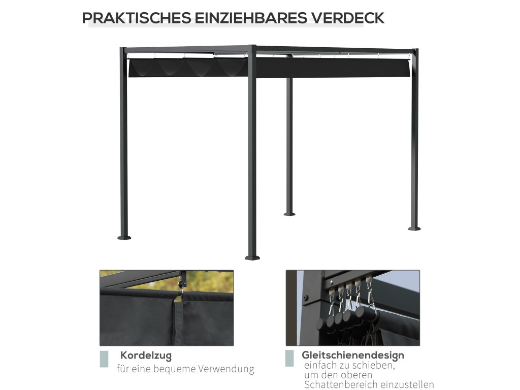 ✔ Strechu záhradného altánku možno vysúvať a zasúvať pomocou systému priebežných koľajničiek