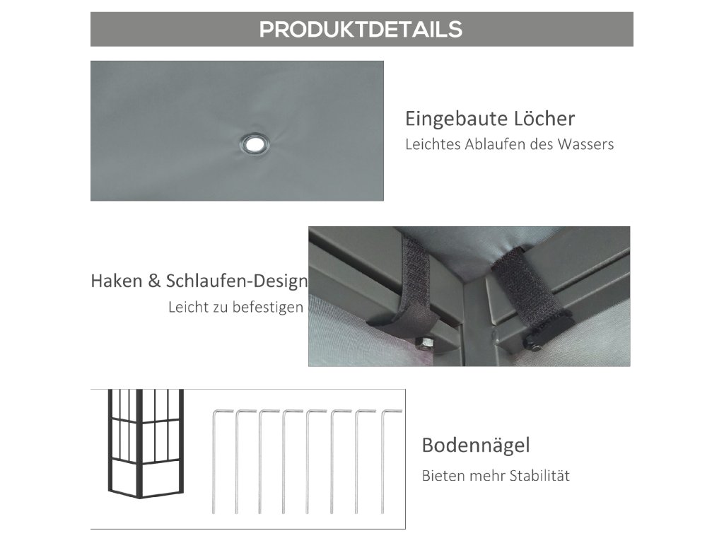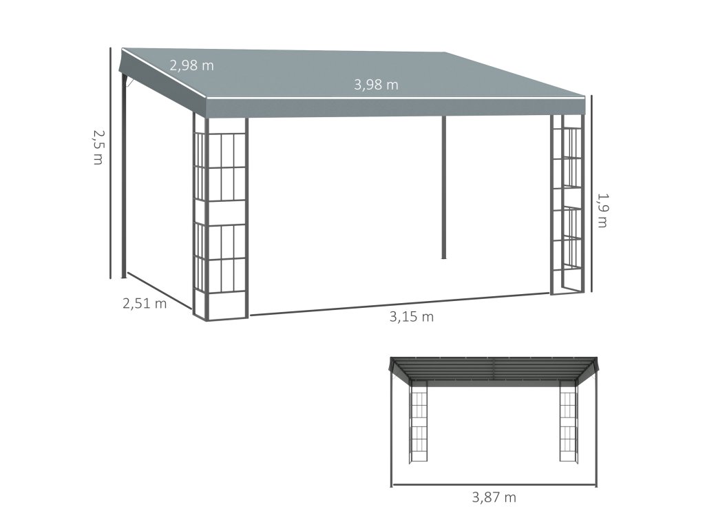 Tento altánok s rozmermi 4 x 3 m od spoločnosti Outsunny dodá elegantný vzhľad každému vonkajšiemu prostrediu! Altánok poskytuje ideálne útočisko počas slnečných dní a umožňuje množstvu ľudí vychutnať si chladný vánok v tieni pod veľkorysou strešnou plochou. Šikmá strecha je vyrobená z potiahnutého polyesteru a má dva vetracie otvory, ktoré umožňujú nerušený odtok dažďovej vody. Pridajte túto pergolu do svojej záhrady a užívajte si pokoj prírody naplno!