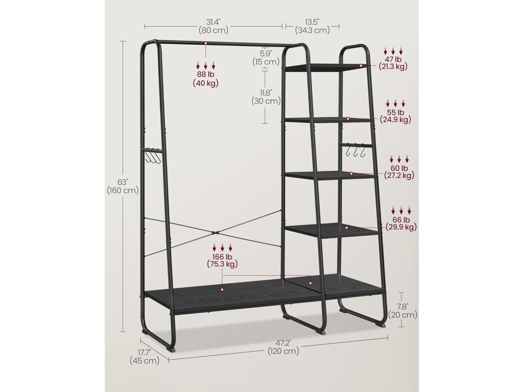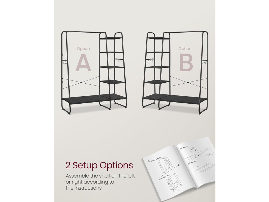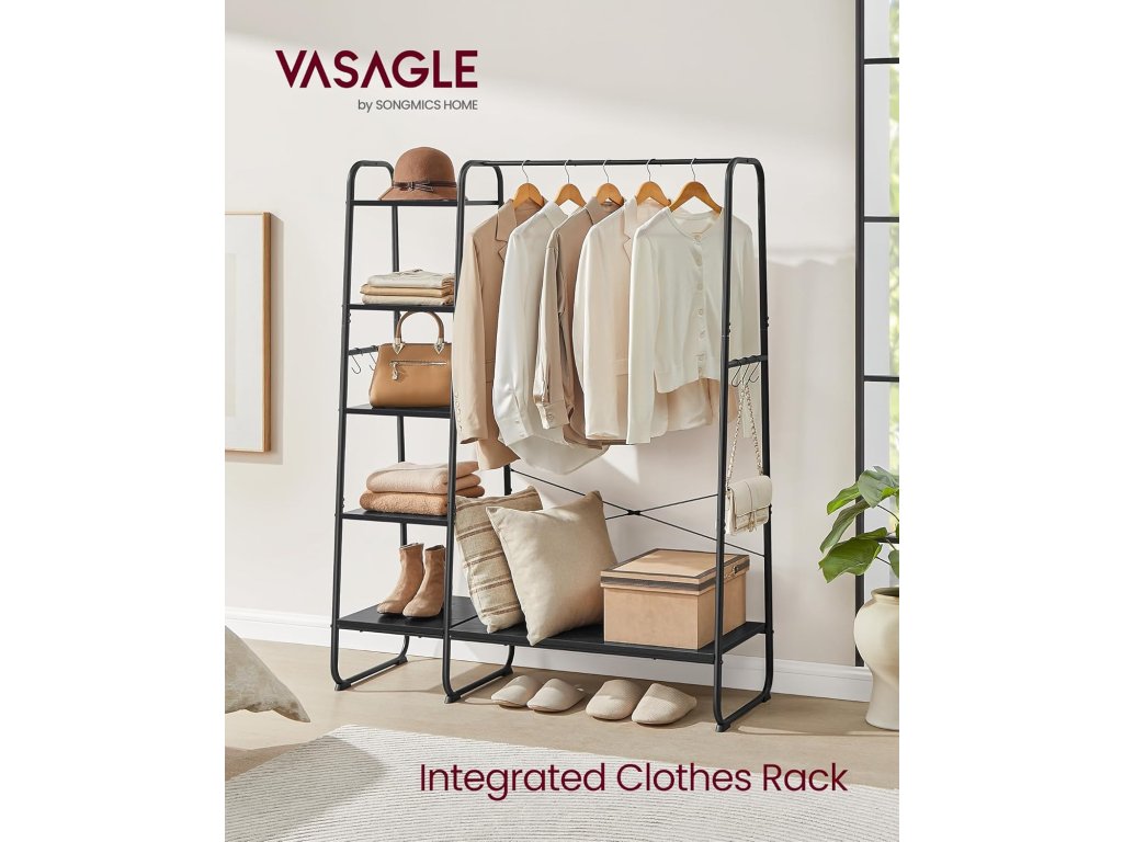 Vešiak na oblečenie kombinuje závesnú tyč, policu na topánky, 5 úložných políc a 6 bočných háčikov v tvare písmena S v jednom, aby poskytol vášmu oblečeniu, topánkam, taškám, dekoráciám a rastlinám dokonalé útočisko.