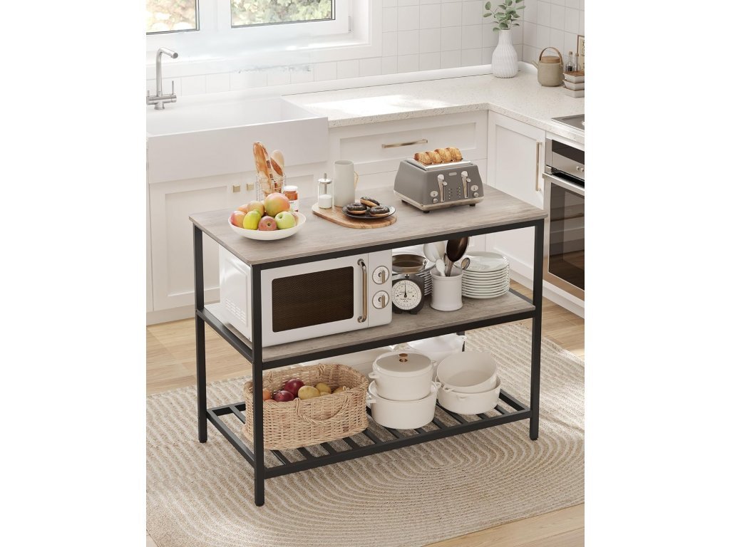Na hornú policu umiestnite vázu s kvetmi alebo čajovú súpravu, na strednú policu kuchynské spotrebiče a na spodnú mriežkovanú policu úložné boxy s pomôckami na pečenie - na tomto trojúrovňovom ostrovnom stole je všetko pekne usporiadané a ľahko dostupné.