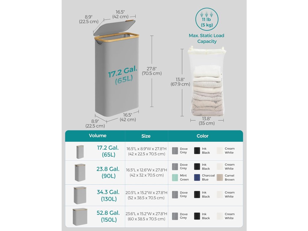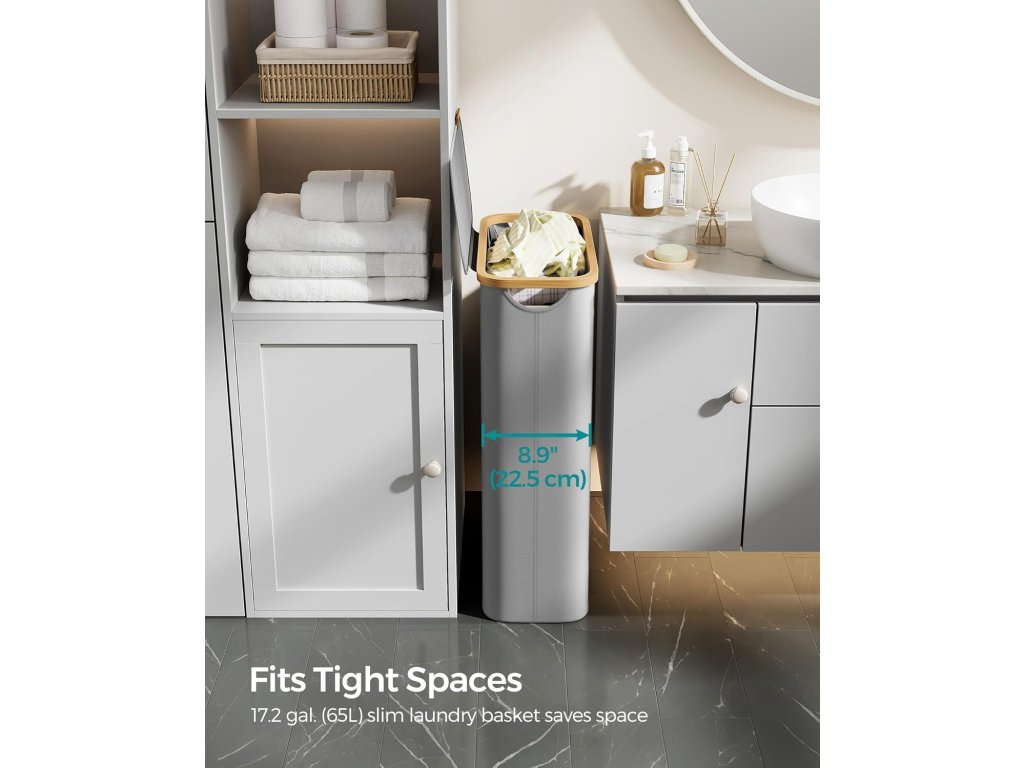 Úzky a vysoký košík na bielizeň s objemom 65 litrov a rozmermi 42 x 22,5 x 70,5 cm je špeciálne navrhnutý tak, aby sa zmestil do stiesnených priestorov, čo z neho robí ideálny košík na bielizeň pre malé obytné priestory alebo kompaktné práčovne.