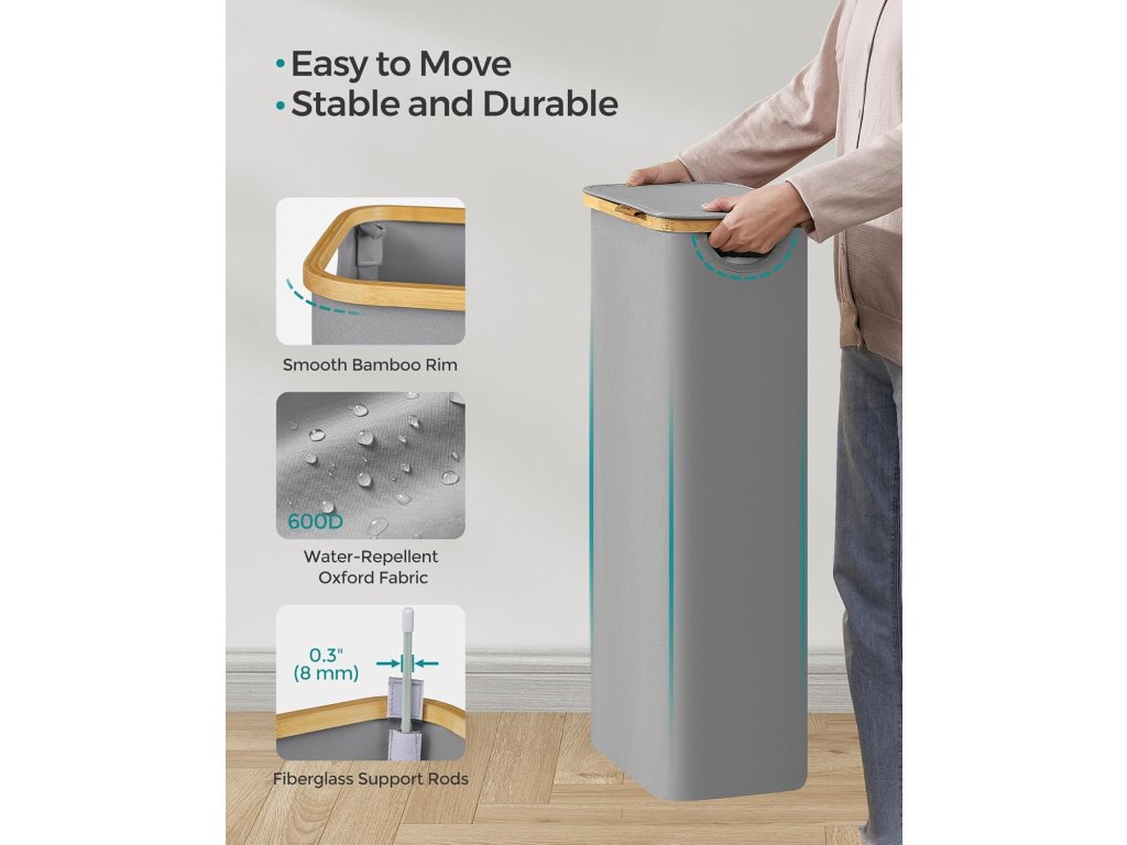 Koš na bielizeň je vyrobený z hustej tkaniny Oxford 600D, ktorá je odolná voči vode, odolná voči roztrhnutiu a ľahko sa čistí. Jeho vnútorná konštrukcia, vystužená sklenenými vláknami, zaisťuje spoľahlivé používanie.