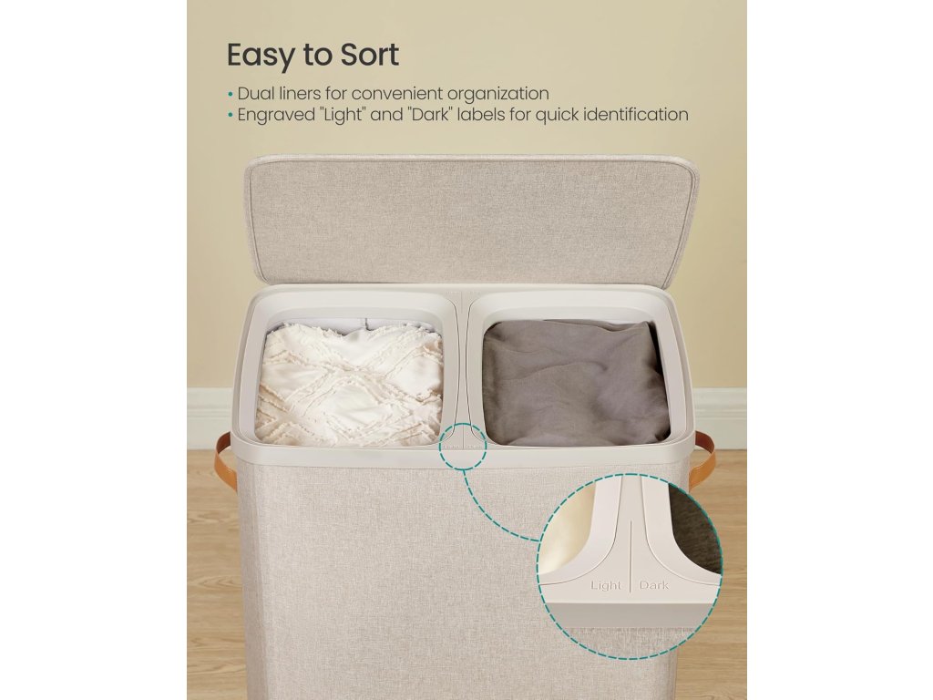 Tento kôš na bielizeň s 2 oddelenými priehradkami označenými na ráme ako "Svetlá" a "Tmavá" umožňuje triediť bielizeň a zjednodušuje pranie.