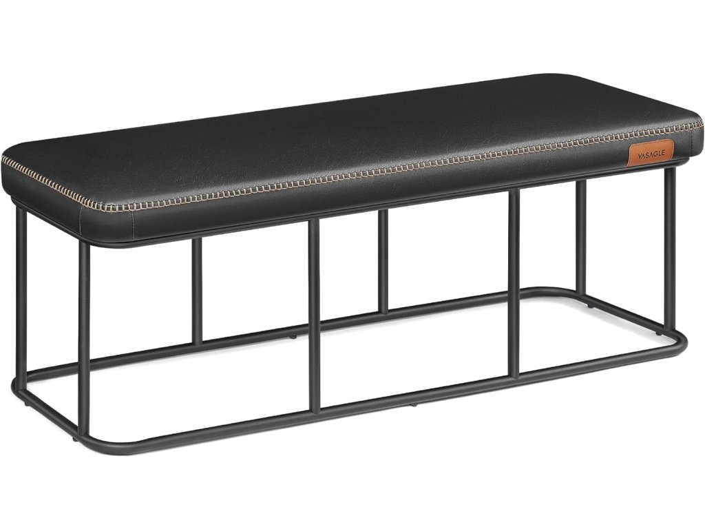 Čierna, čalúnená, polstrovaná, moderná lavica VASAGLE EKHO s oceľovým rámom.