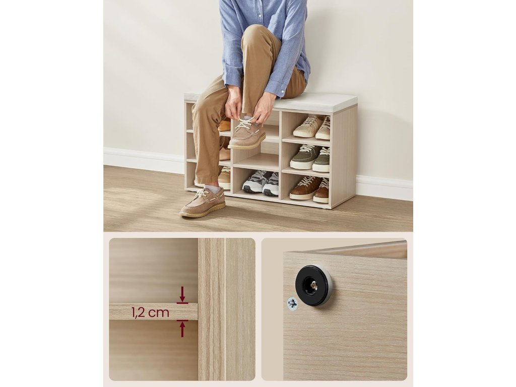 Stojan na topánky s lavicou a 12 policami je riešením na všetok neporiadok v predsieni. S týmto botníkom môžete zabudnúť na neporiadne hromady topánok. Má dvanásť priestranných priehradiek s hĺbkou 11,7 cm a šírkou 9,6 cm, do ktorých pohodlne uložíte až dvanásť párov pánskych topánok. Priehradky v bočných priehradkách sú nastaviteľné a odnímateľné, takže sa ľahko prispôsobia vašim potrebám - budú sa hodiť aj na uloženie topánok, tenisiek, košíkov a iného vybavenia.