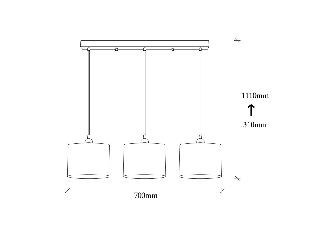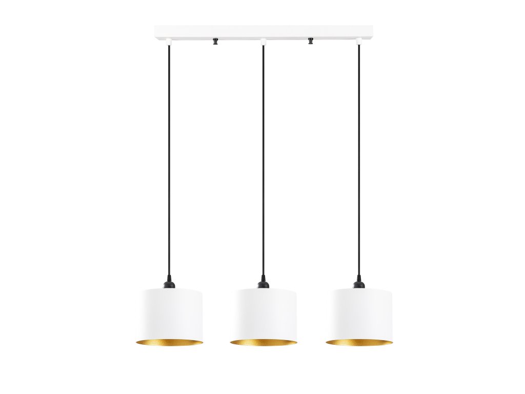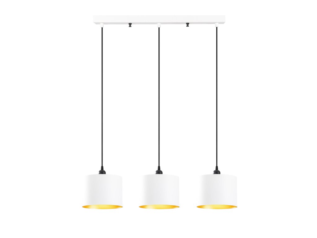 Luster BERCESTE vyzerá ako tri zavesené biele plechovky zvnútra natreté zlatou farbou, ktoré vydávajú zlatisté svetlo.