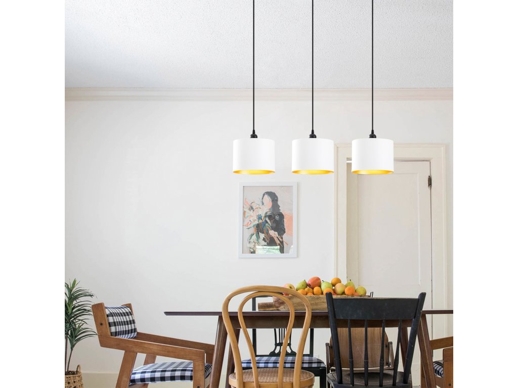 Luster BERCESTE tvorí základňa s elegantnými bielymi tienidlami so zlatými vnútrajškami umocňujúcimi teplé svetlo, ktoré vydáva.