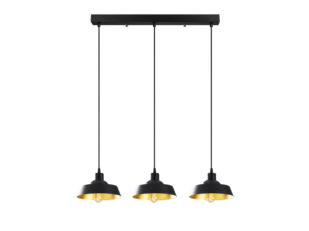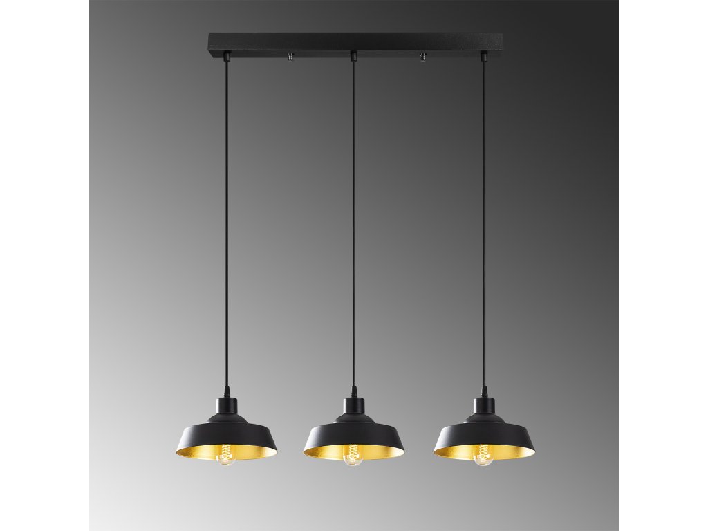 Čierny luster BERCESTE je tvorený podlhovastou základňou, z ktorej visia tri elegantné tienidlá, ktorých zlaté vnútro umocňuje efekt teplého svetla.