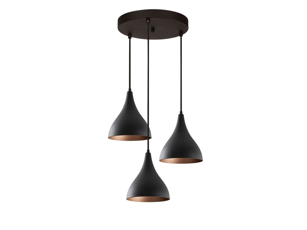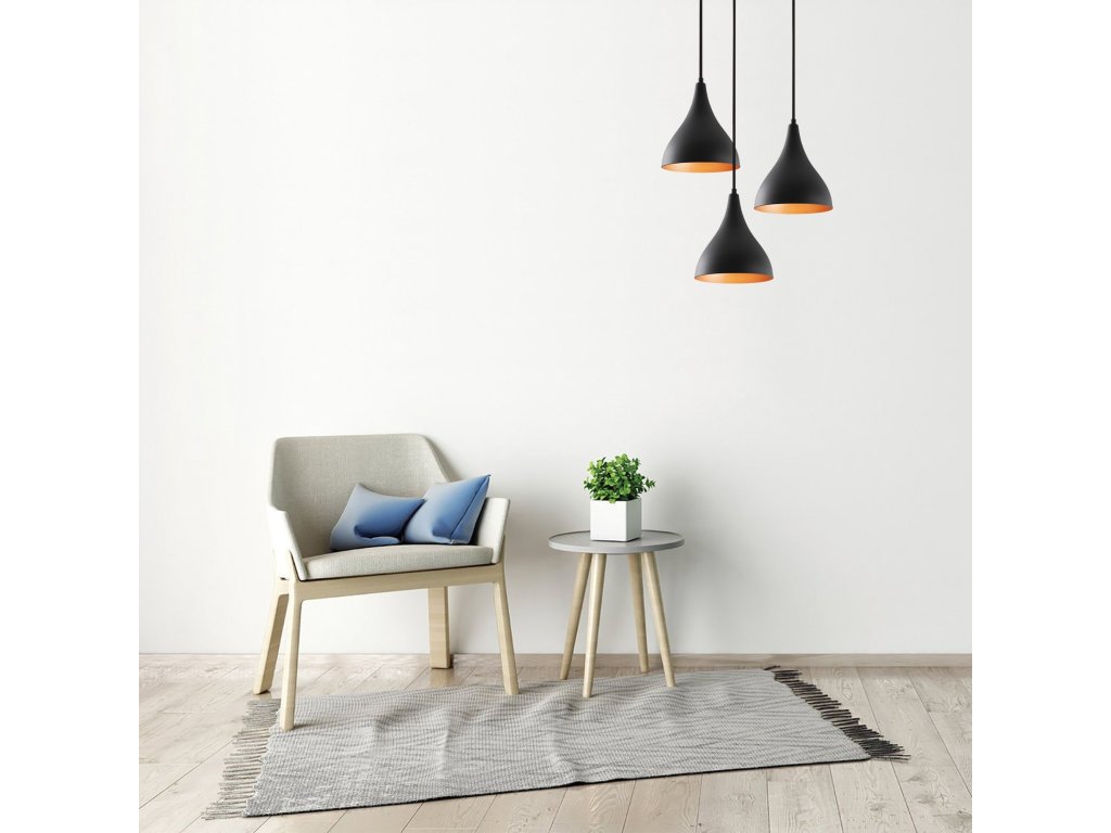 Čierny luster BERCESTE má kruhovú základňu, z ktorej visia tri rovnaké tienidlá so zlatým vnútrom.