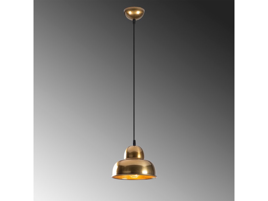 Luster BERCESTE má drobnú základňu, z ktorej visí robustnejšie tienidlo, ktoré je opatrené zlatou povrchovou úpravou.