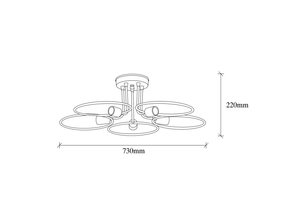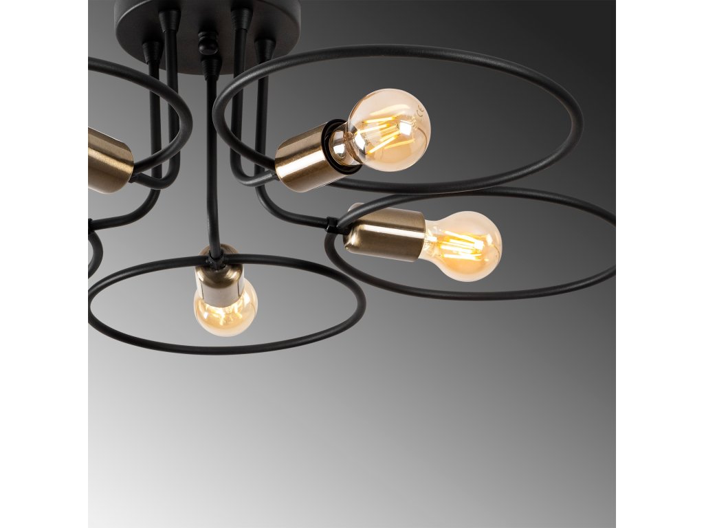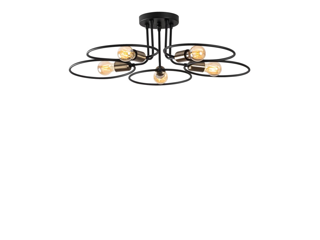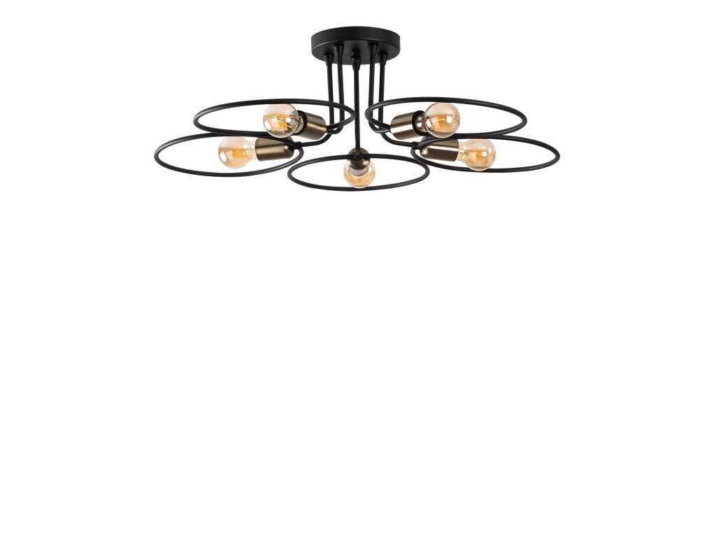 Čierny kovový luster s piatimi svetlami s okrúhlymi kovovými detailmi okolo.