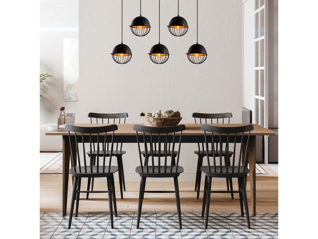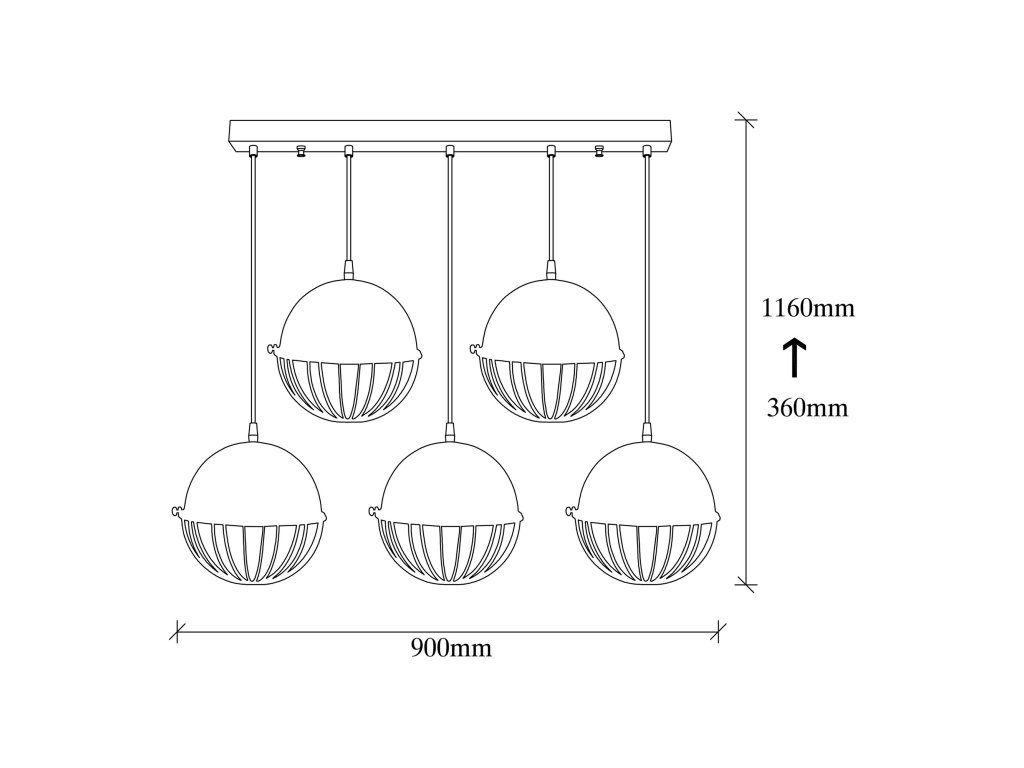 Luster SIVANI TEL je tvorený pozdĺžnou úzkou základňou, z ktorej visí 5 tienidiel v industriálnom štýle, ktorých vnútro je v zlatej farbe.