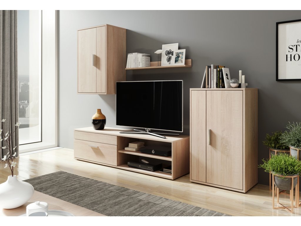 Urobte si radosť modernou obývacou stenou Berno v škandinávskom štýle v dekore dub sonoma. Táto súprava vám poskytne všetko, čo v obývacej izbe potrebujete. TV stolík, komoda, vitrína a polica.
