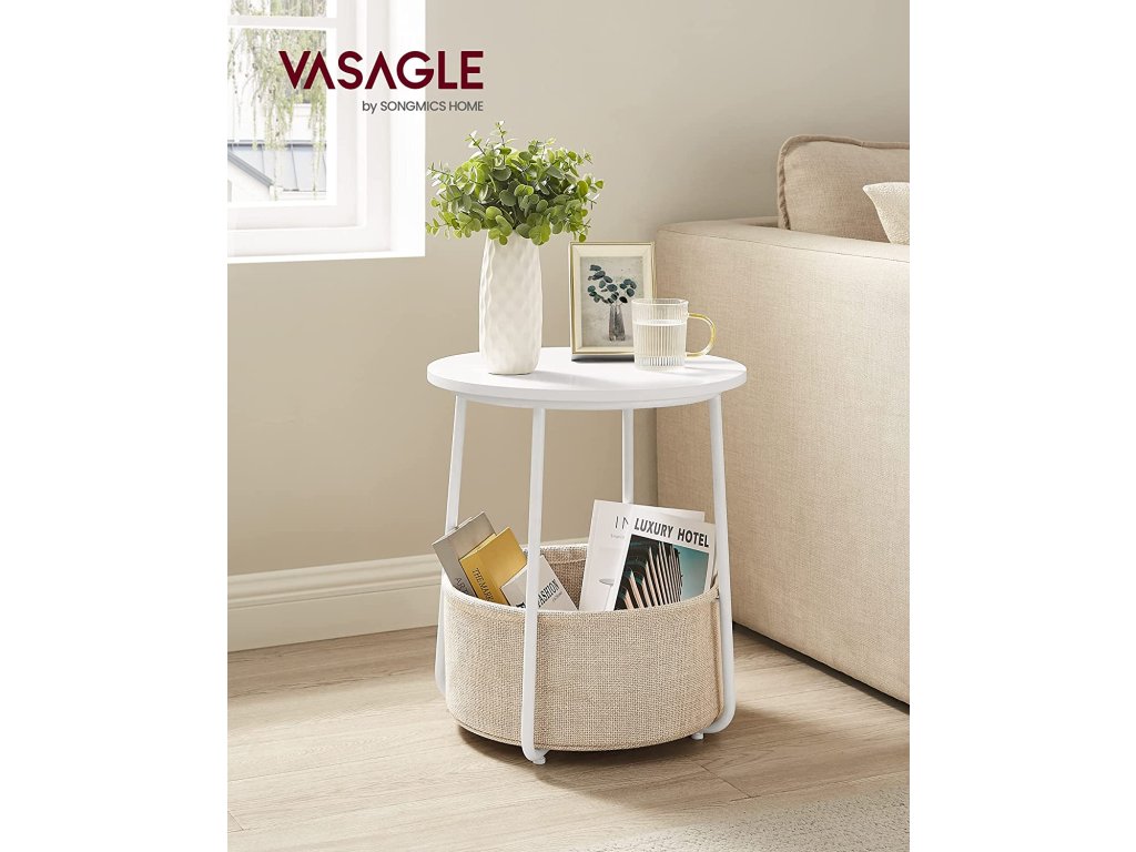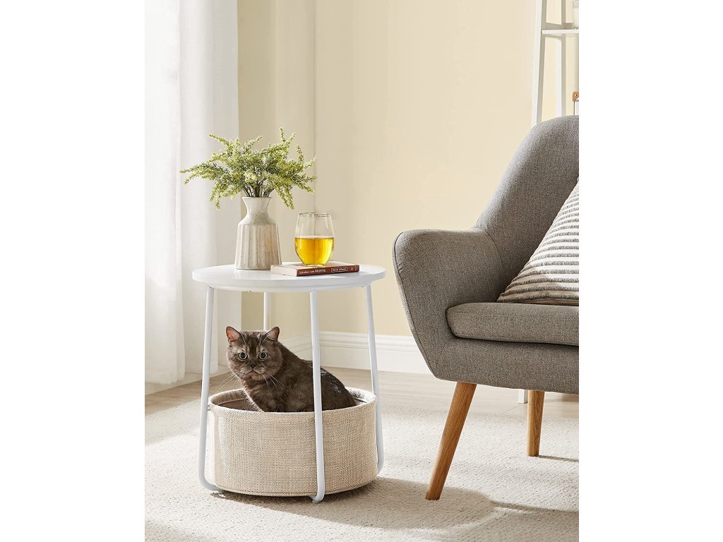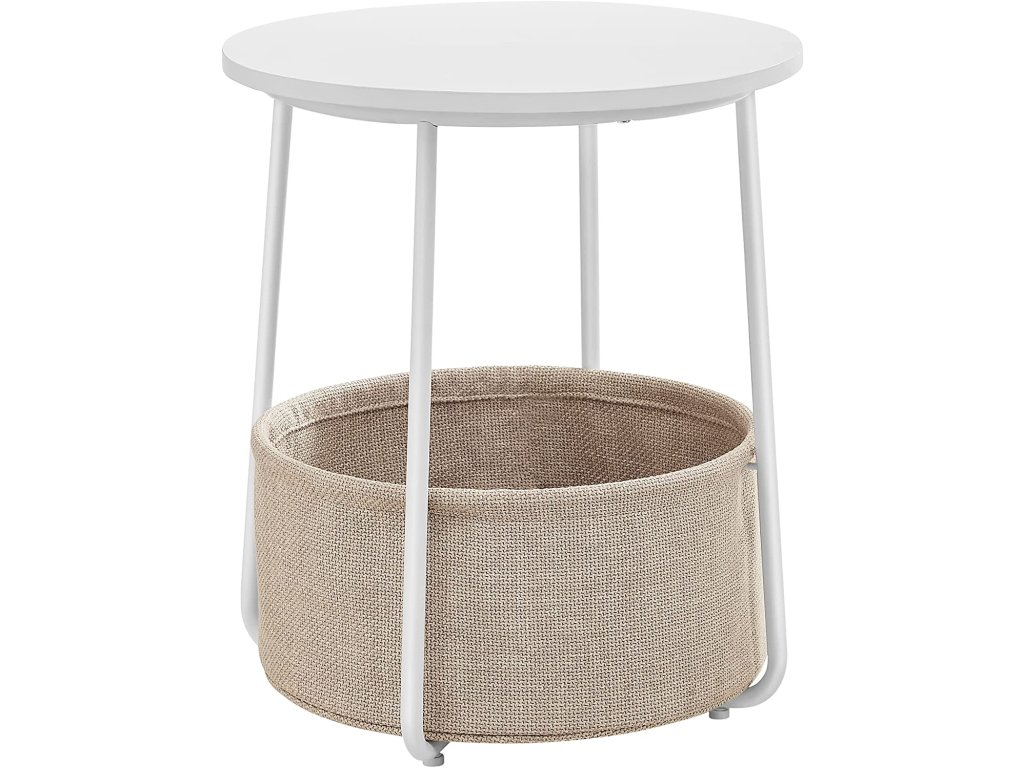 Okrúhly odkladací stolík s textilným košom biely