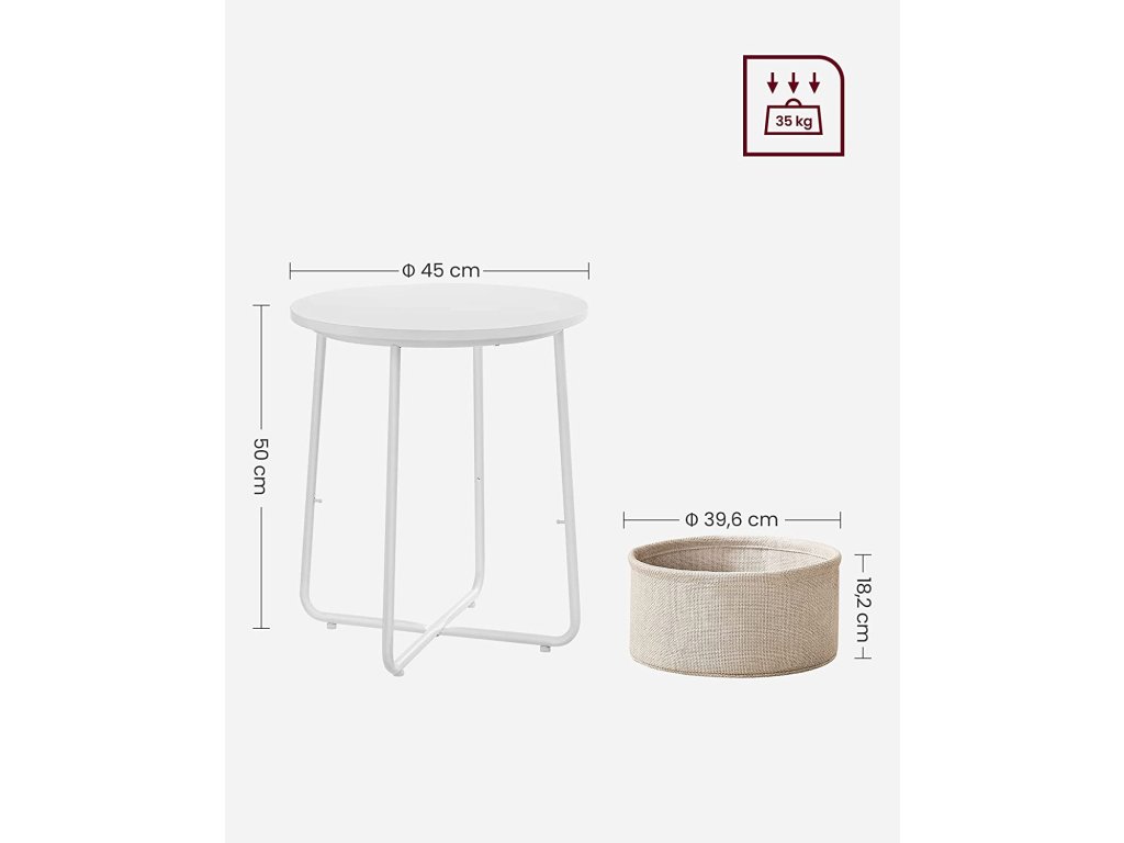 Odkladací stolík s rozmermi 45 x 50 cm (priemer x výška) s košom s rozmermi 39,6 x 18,2 cm (priemer x výška) je vhodný do malých priestorov. Ako príručný stolík v obývacej izbe alebo ako nočný stolík v spálni nie je objemný, ale ponúka dostatok úložného priestoru na vaše veci.