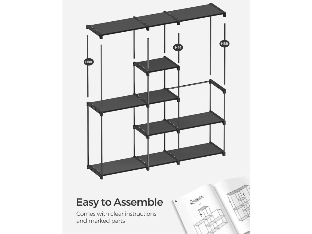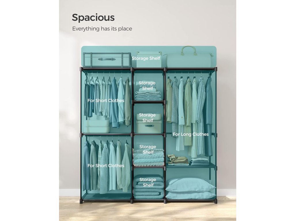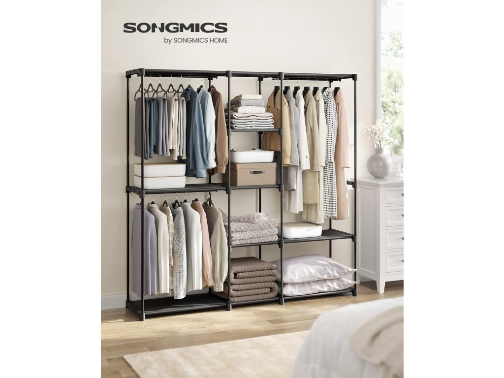 Táto priestranná skriňa s výškou 182 cm, vybavená 11 policami, 2 tyčami na zavesenie krátkych odevov a 1 tyčou na zavesenie dlhých odevov, uspokojí vaše rôzne potreby a pomôže vám vytvoriť uprataný domov.