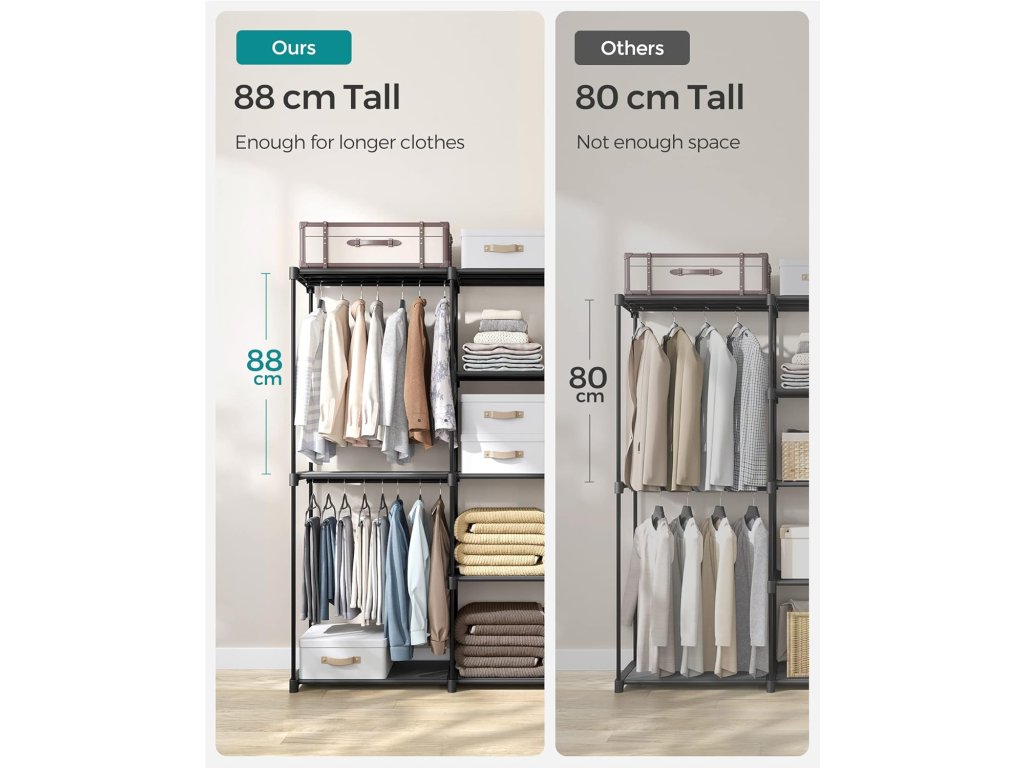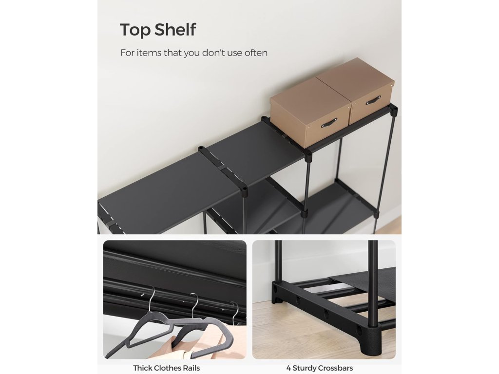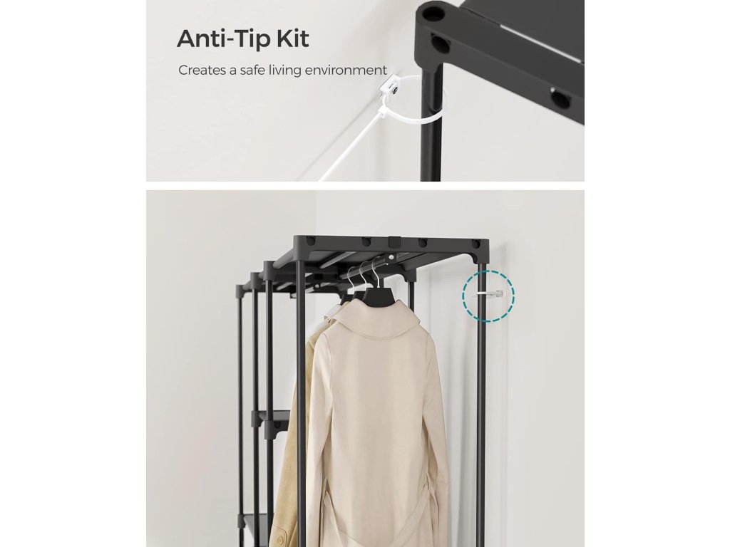 Táto otvorená skriňa je vyrobená z hrubých oceľových rúrok a prvotriednej netkanej textílie a unesie celkovú hmotnosť 130 kg. Každá veľká polica unesie až 10 kg, malé police až 5 kg a vešiaky na odevy až 15 kg.