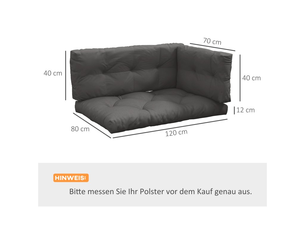 - Informácie: Vankúše sú odolné proti škvrnám a postriekaniu: Rozmery vankúša na sedenie: 120L x 80W x 12H cm, rozmery vankúša na chrbát: 120L x 40W x 12H cm, rozmery bočných vankúšov: 70L x 40W x 12H cm