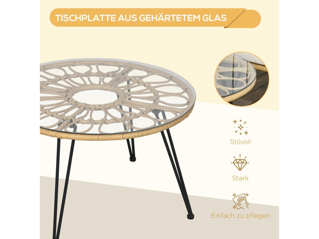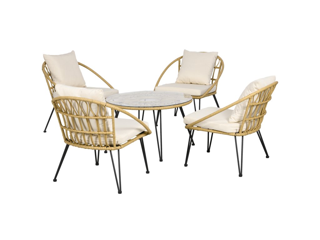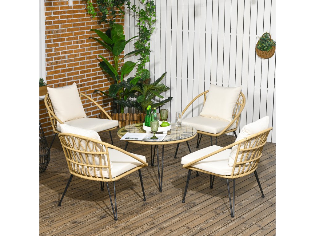 Premenite svoju záhradu na štýlovú jedáleň s ratanovou sedacou súpravou Outsunny, ktorá sa skladá z okrúhleho terasového stola a štyroch stoličiek. Zaborte sa do mäkkých vankúšov kresiel a obdivujte krásu a funkčnosť dosky z tvrdeného skla. Táto súprava záhradného nábytku je vyrobená z PE ratanu odolného voči poveternostným vplyvom a má oceľový rám s práškovou povrchovou úpravou a sľubuje príjemné posedenie vonku.