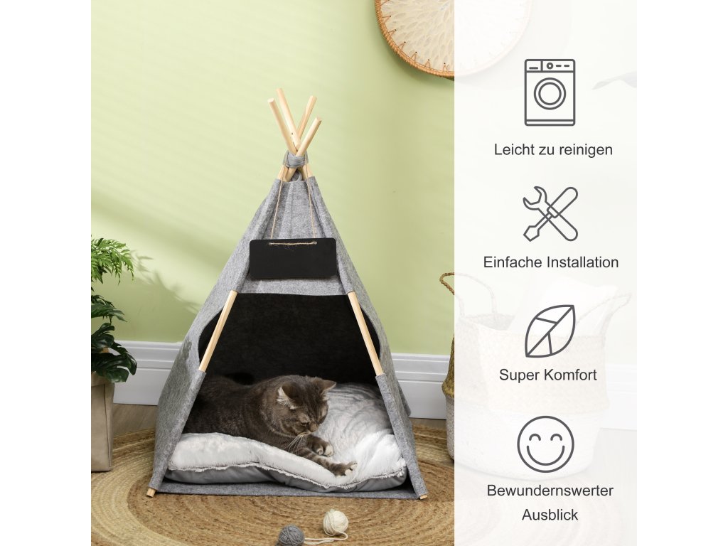 Trendy zvierací stan v prevedení teepee sa skladá zo stabilnej konštrukcie z robustnej plsti a borovicového dreva. Integrovaný vankúš ponúka vášmu miláčikovi útulné miesto na spanie. Vaši miláčikovia sa môžu hrať, vyvádzať a spať v tomto stane pre domácich miláčikov od PawHut.