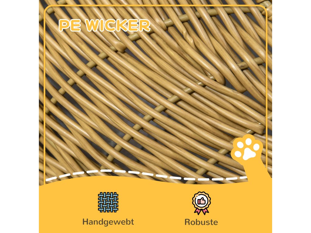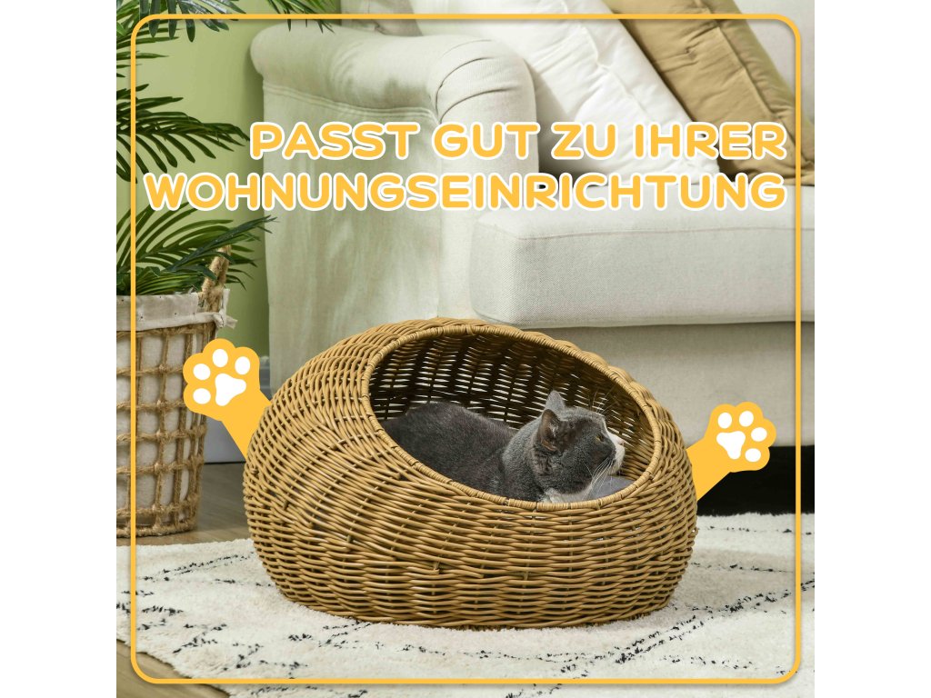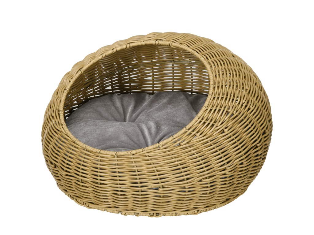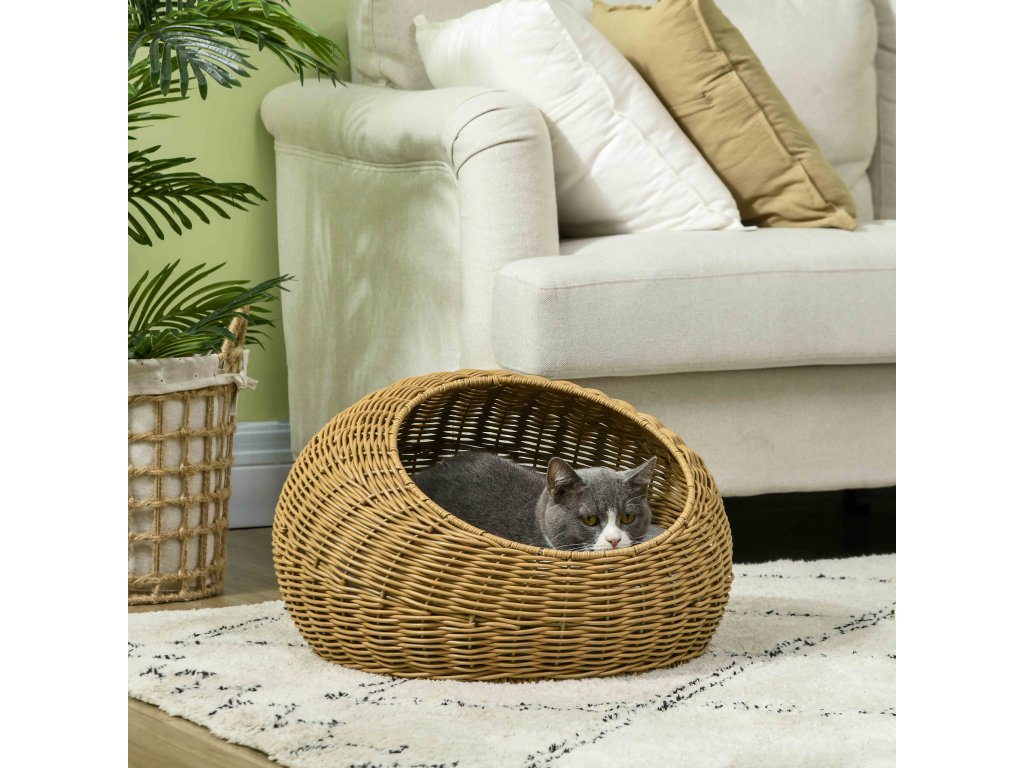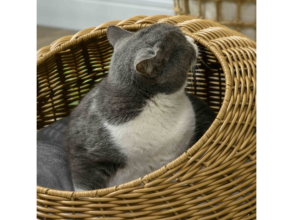 Domček pre mačky sa vyznačuje elegantným ratanovým dizajnom, ktorý sa perfektne hodí do každého interiéru a dodáva mu štýlový akcent.