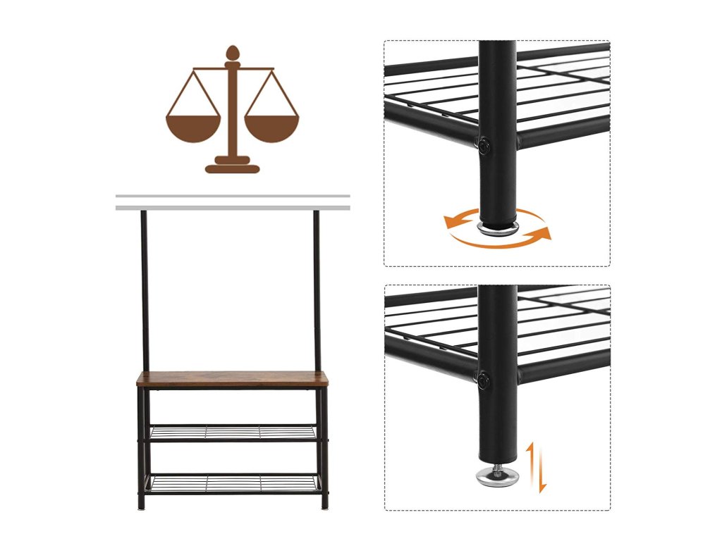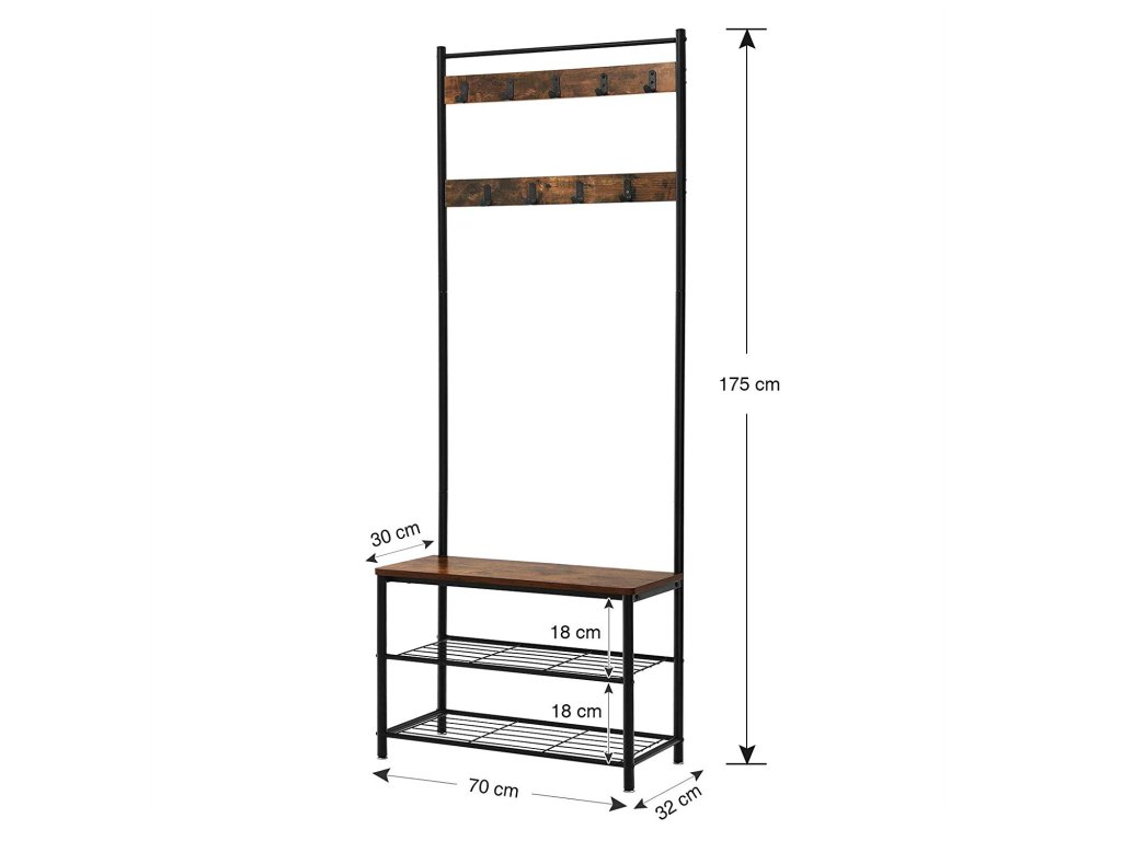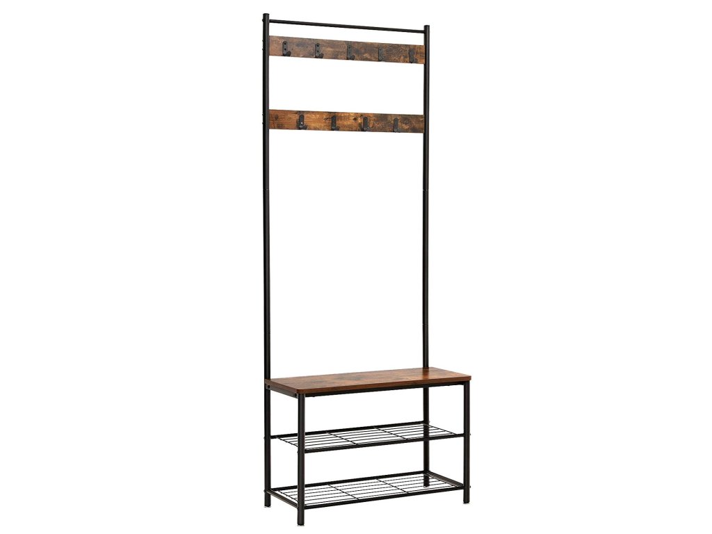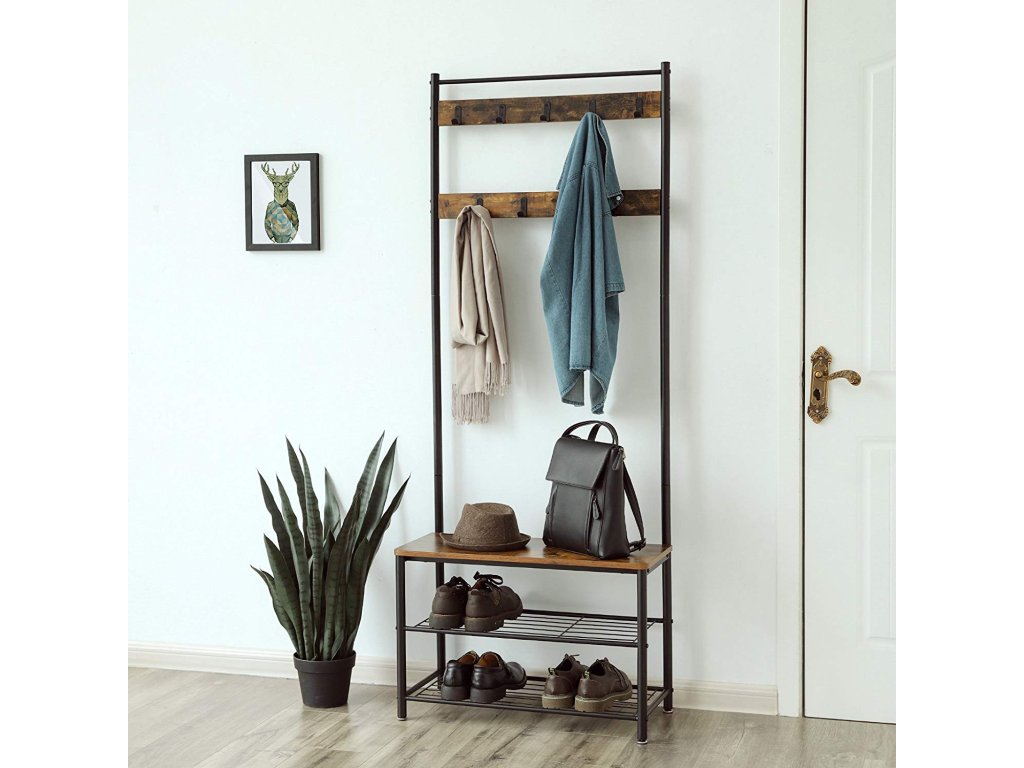 Predsieňový stojan, ktorý dokonale kombinuje stojan na klobúky a kabáty, lavičku na topánky a úložný stojan na topánky.