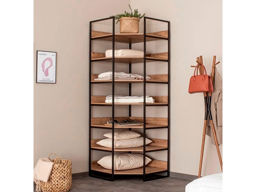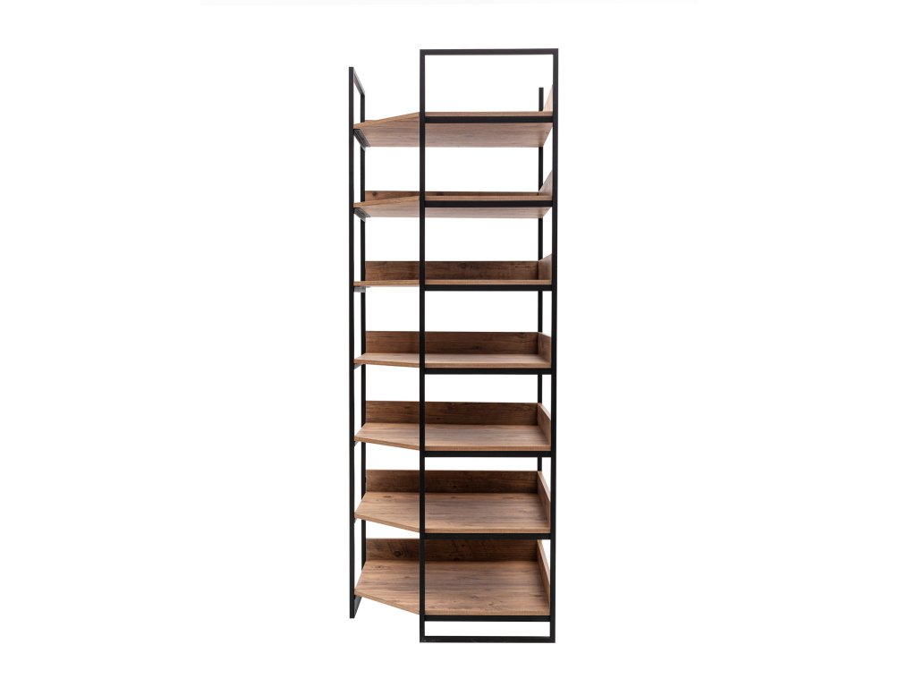 Rohový regál kolekcie DYAMIC so siedmimi priestrannými policami a kovovou konštrukciou.