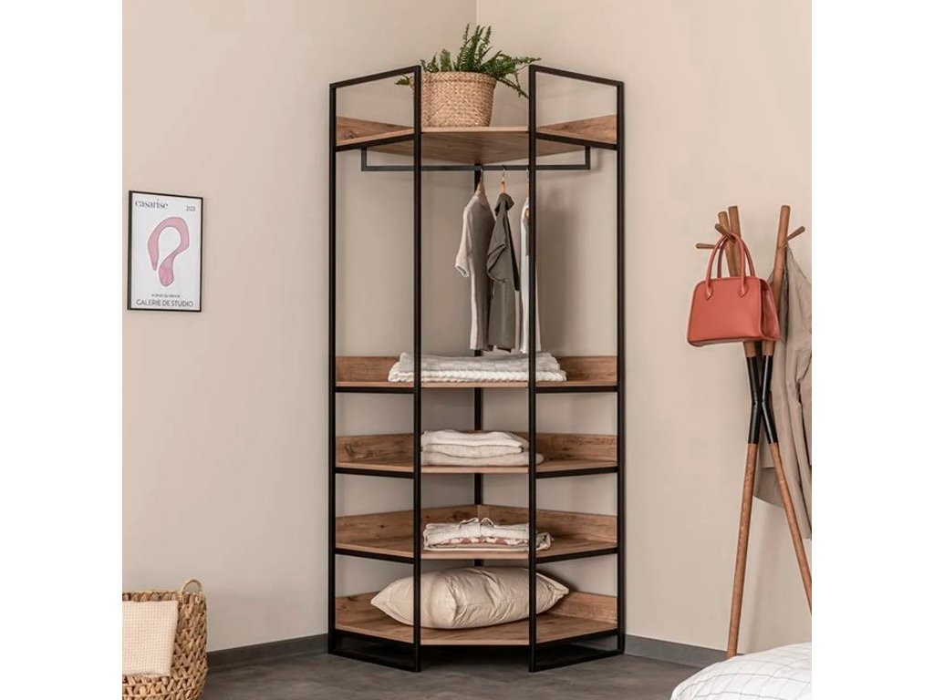 Rohový regál kolekcie DYAMIC s piatimi priestrannými policami, tyčou na košele a kovovou konštrukciou.