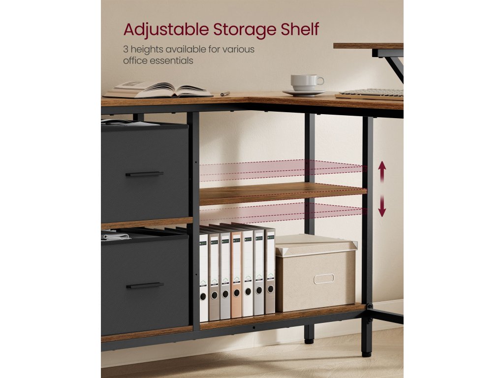 Rohový stôl s 2 priestrannými zásuvkami ponúka dostatok miesta na dokumenty a kancelárske potreby. Stredná polica je nastaviteľná do 3 výškových polôh, aby vyhovovala vašim potrebám.