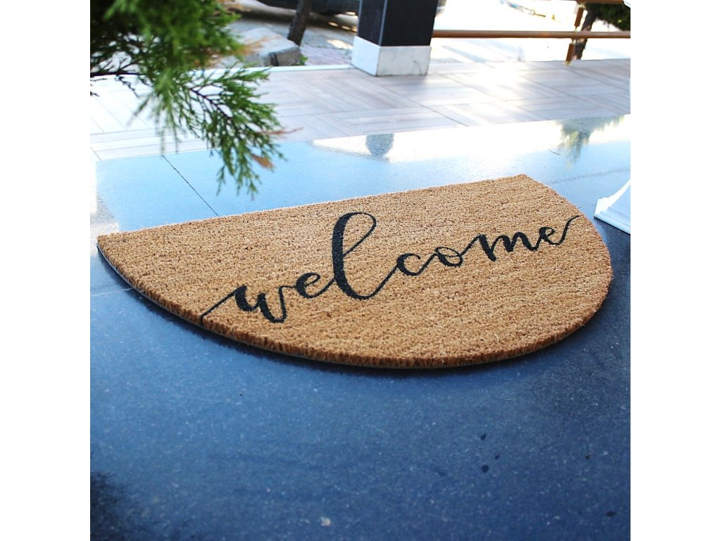 Podložka s nápisom z kokosového vlákna.