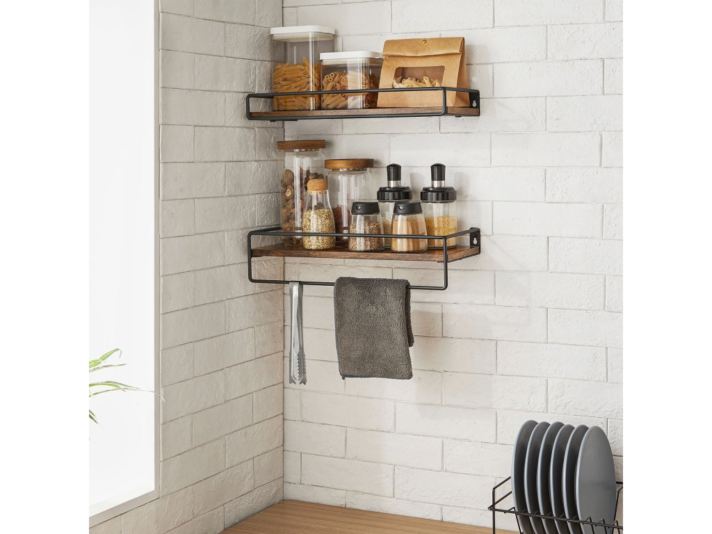 Pár políc v rustikálnej hnedej farbe s drôteným rámom a konzolami na háčiky.