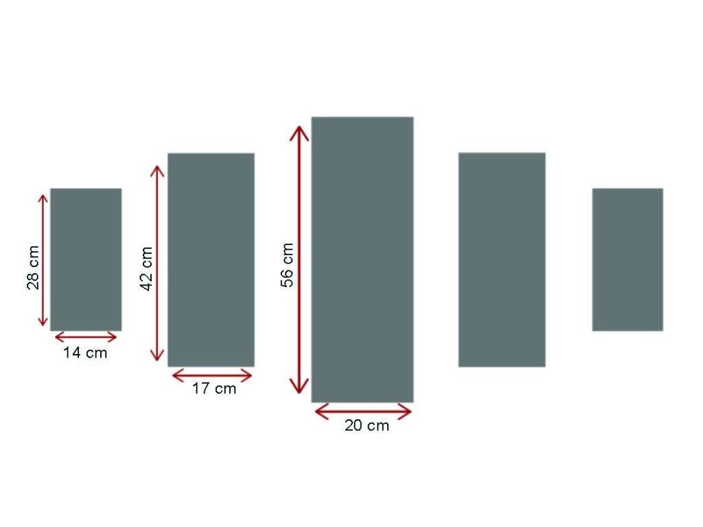 Veľkosť: 56 x 20 cm (1 kus) 42 x 17 cm (2 kusy) 28 x 14 cm (2 kusy)