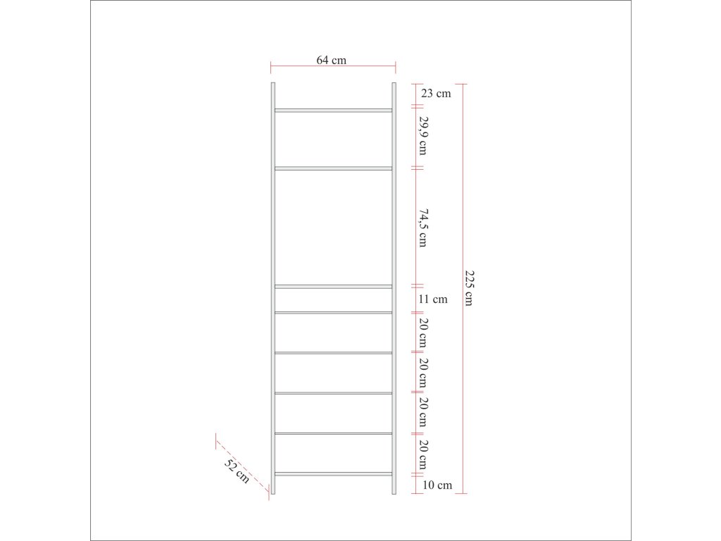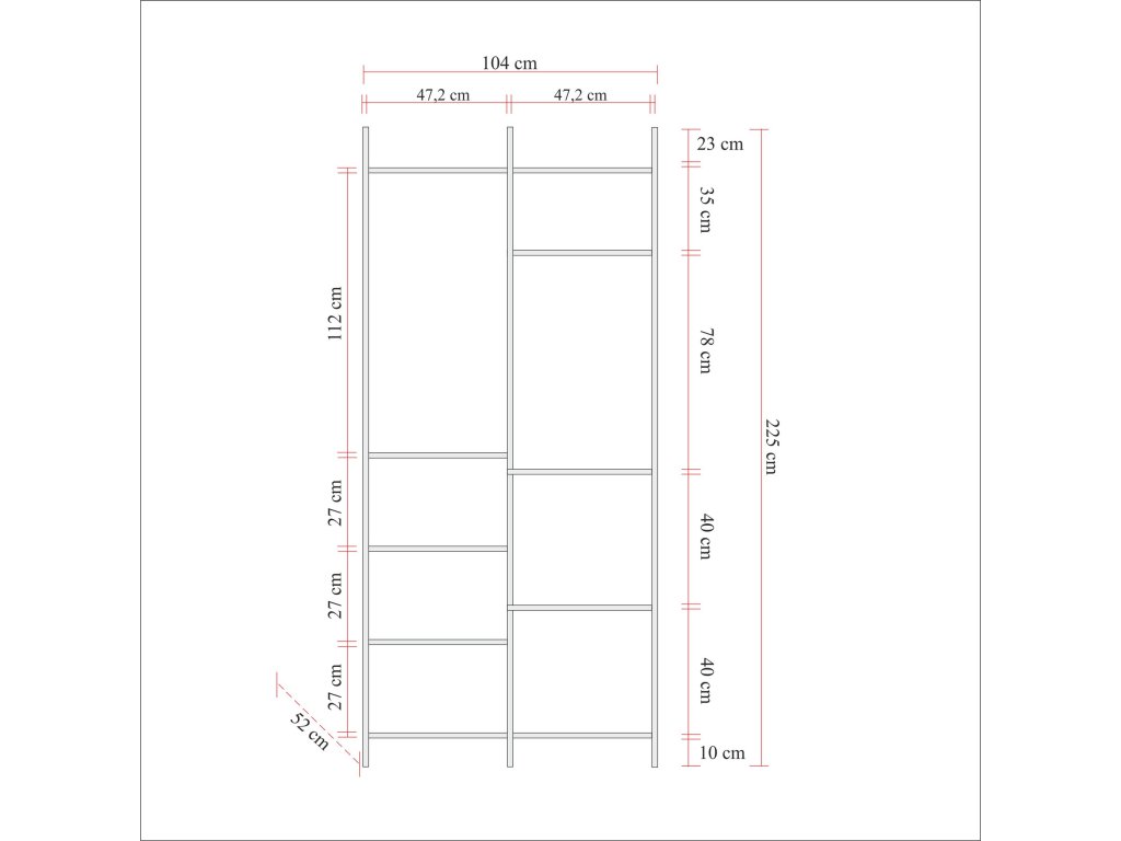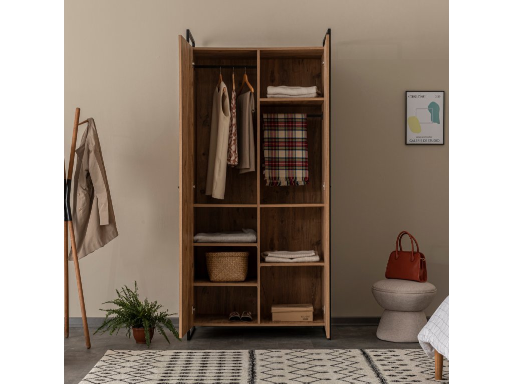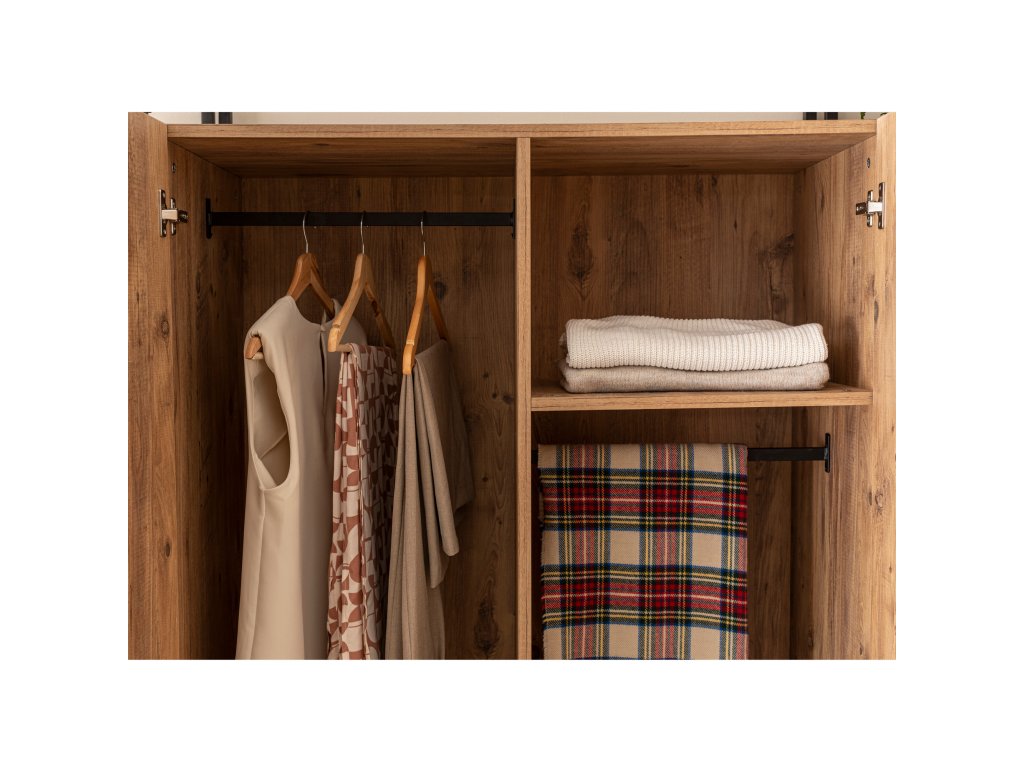 Dvojdielna priestranná šatníková skriňa s mnohými policami vo vnútri na uloženie odevov. V uzatvárateľnej časti skrine sú tyče, ktoré slúžia na zavesenie nohavíc alebo kabátov.