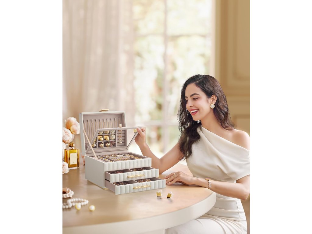 Veko trojposchodovej šperkovnice ponúka priestor až na 10 náhrdelníkov, zatiaľ čo horná priehradka a 2 zásuvky sú navrhnuté tak, aby vaše náušnice, prstene a náramky boli prehľadne usporiadané a nezamotané.
