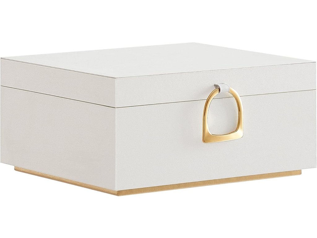 Štýlová, elegantná a nápadne jedinečná šperkovnica vyniká kombináciou bielej a zlatej farby, elegantnou kovovou rukoväťou, ktorá uľahčuje otváranie a zatváranie veka, a výraznou základňou s chladným plávajúcim efektom.