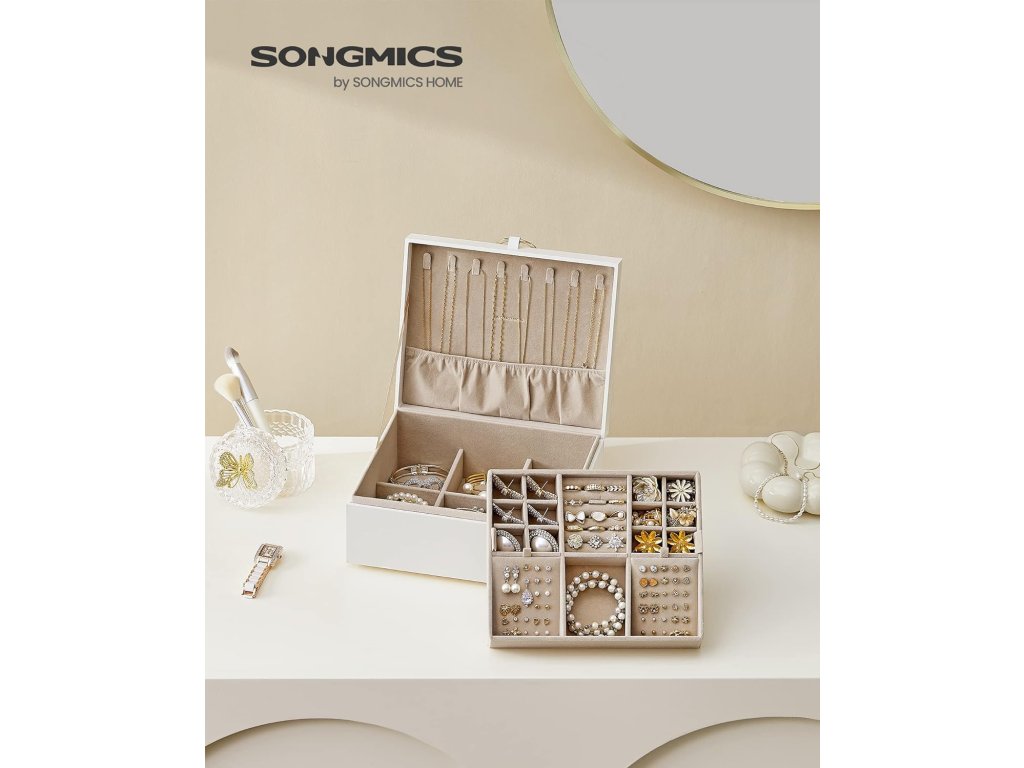 Šperkovnica je väčšia ako zvyčajne a ponúka dostatok priestoru na vaše šperky a doplnky - háčiky na veku na dlhé náhrdelníky, spodná vrstva na slnečné okuliare a rôzne priehradky na náušnice, cvočky, prstene, hodinky a náramky.