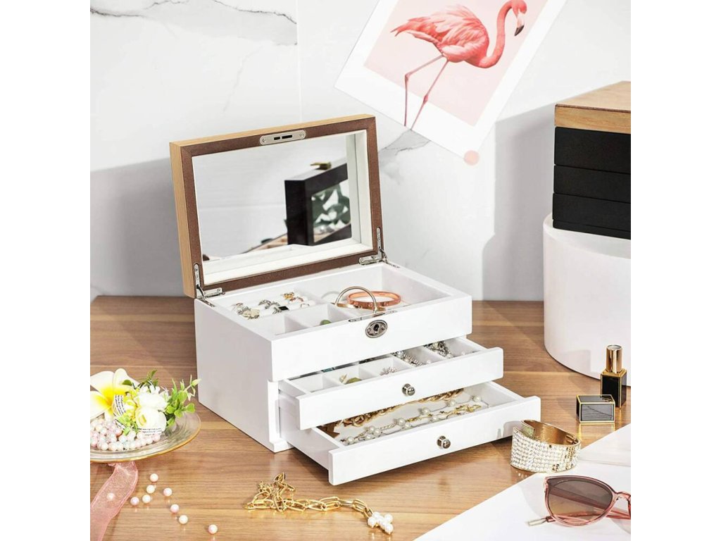 Biela šperkovnica s dreveným vekom je veľmi praktická, uzamykateľná a pozostáva z troch samostatných zásuviek s priehradkami alebo bez nich.