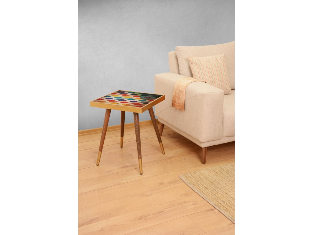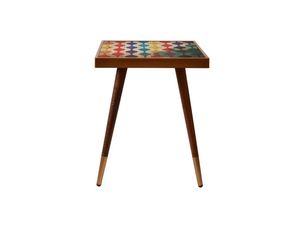 Malý odkladací stolík s farebnou doskou, motív vlnky.