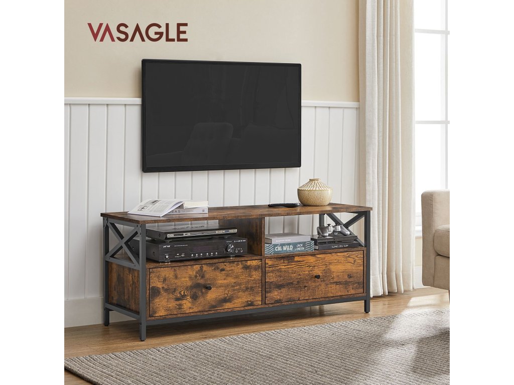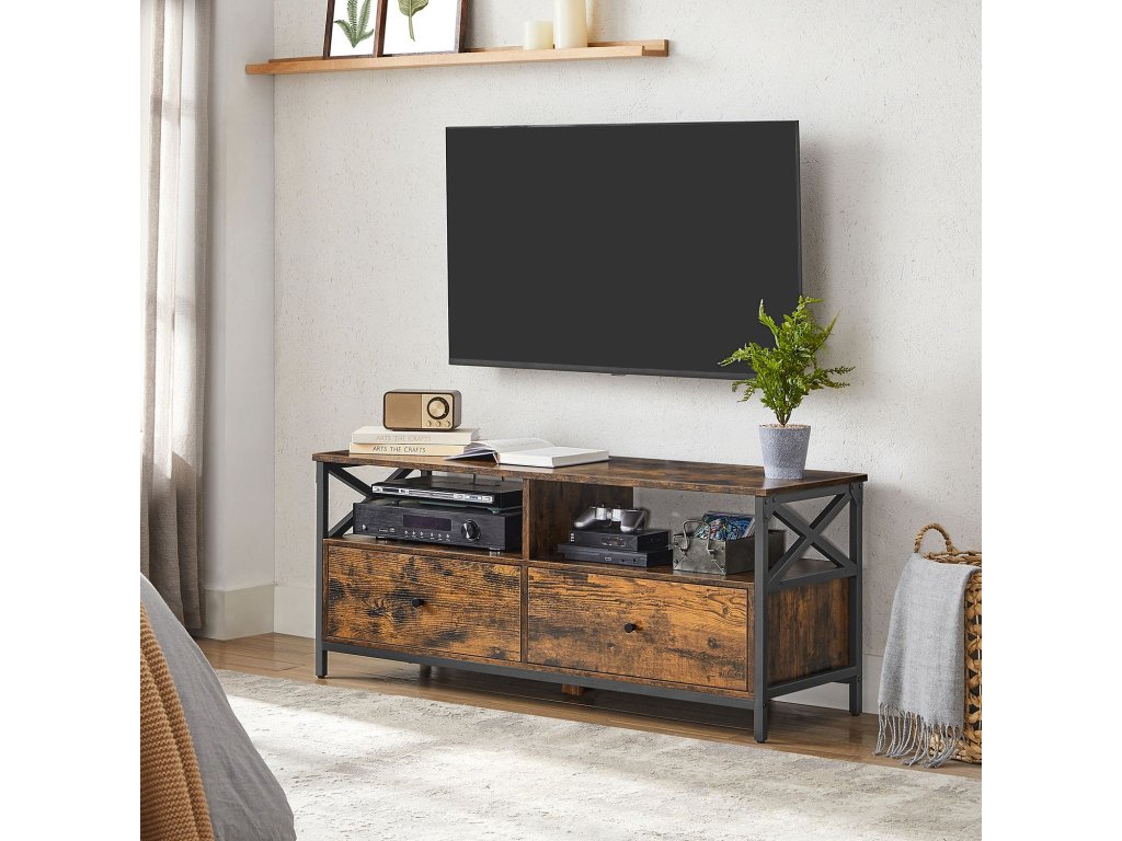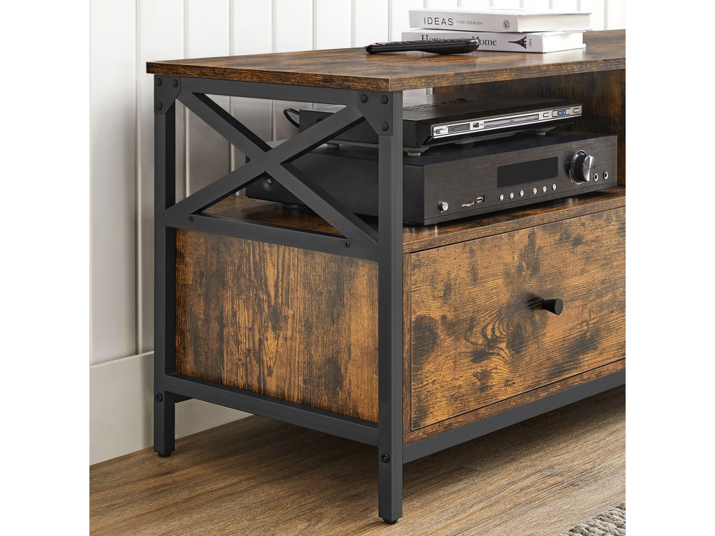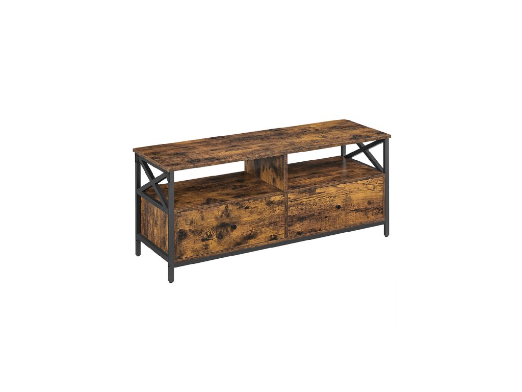 Svojou rustikálnou hnedou farbou a bočným rámom v tvare X sa tento TV stolík stane stredobodom vašej obývačky vďaka svojmu industriálnemu a sofistikovanému štýlu.