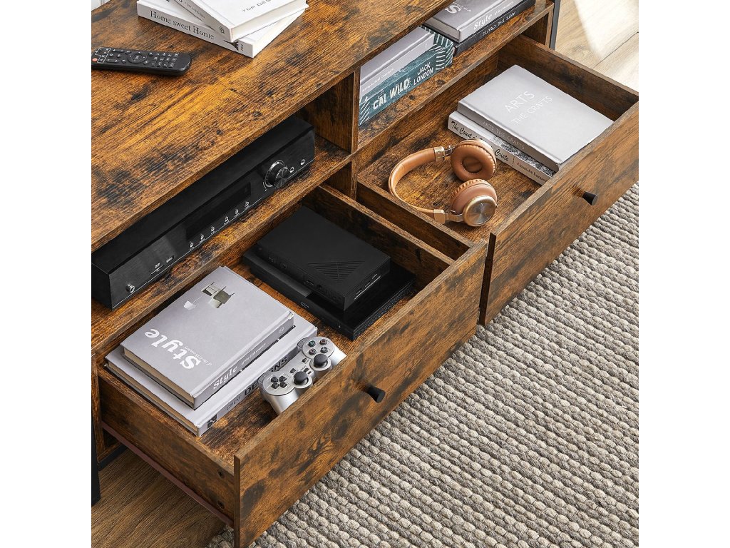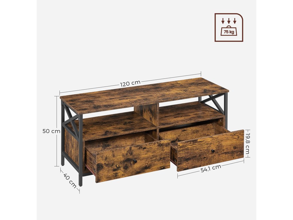 Stojan na televízor má rozmery 40 x 120 x 50 cm a pojme televízor s uhlopriečkou až 55 palcov. Má tiež 2 zásuvky na odkladanie vecí a 2 otvorené police na vystavenie drobností.