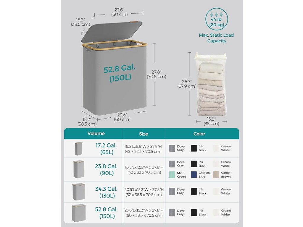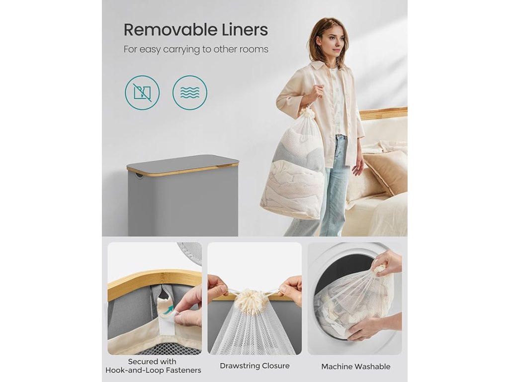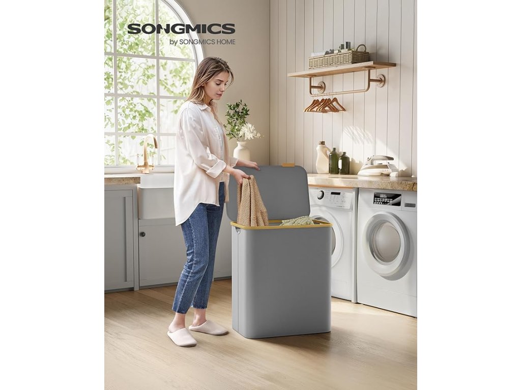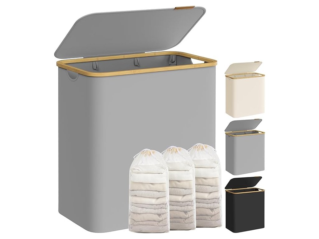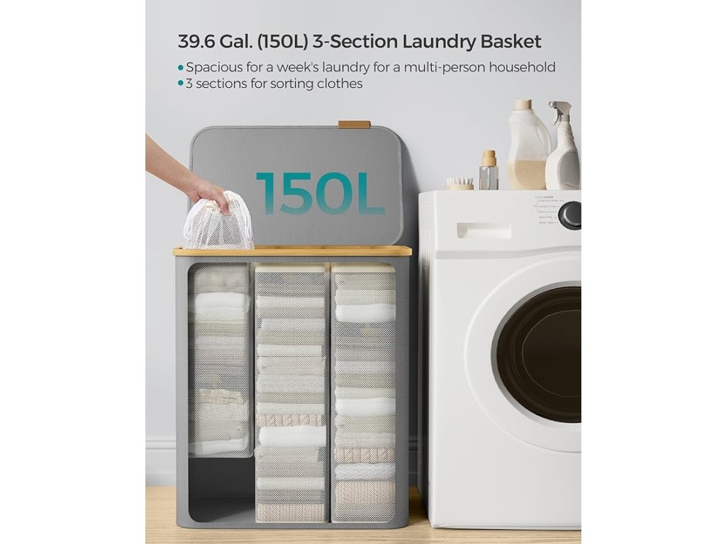 150-litrový košík na bielizeň s rozmermi 60 x 38,5 x 70,5 cm a 3 priehradkami je ideálny na triedenie bielizne v domácnostiach s viacerými členmi a zjednodušenie prania.
