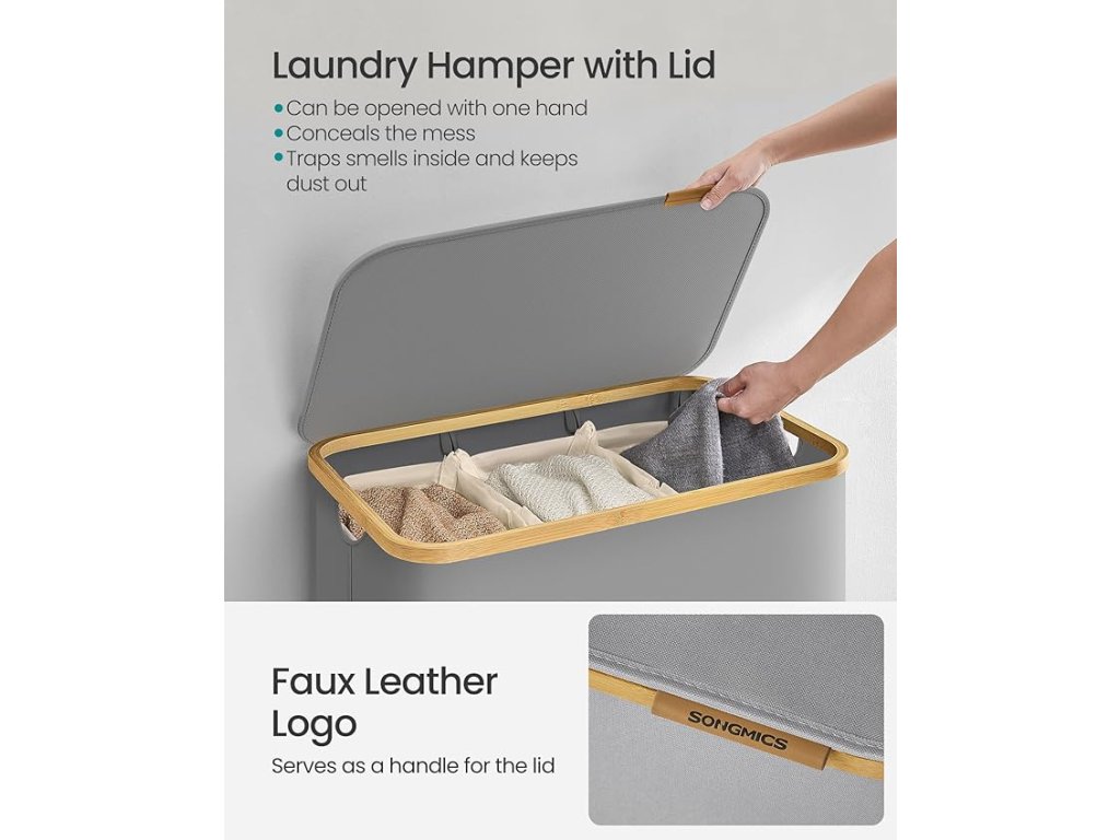 Veko zabraňuje vnikaniu prachu a chráni vaše súkromie. Logo z umelej kože na veku slúži ako rukoväť na ľahké otváranie a dodáva košu eleganciu.