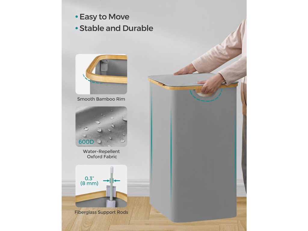 Košík na bielizeň je vyrobený z vystuženej tkaniny 600D Oxford, je odolný voči vode, odolný voči roztrhnutiu a ľahko sa čistí. Jeho vnútorná konštrukcia je vystužená sklenenými vláknami pre väčšiu stabilitu.