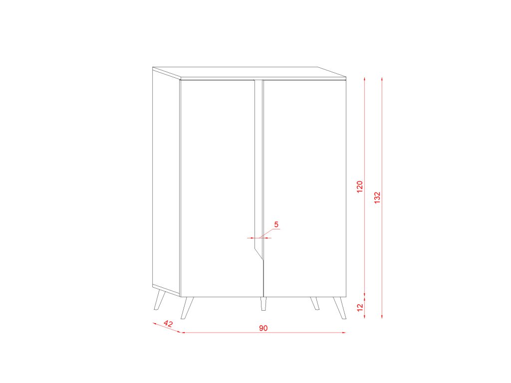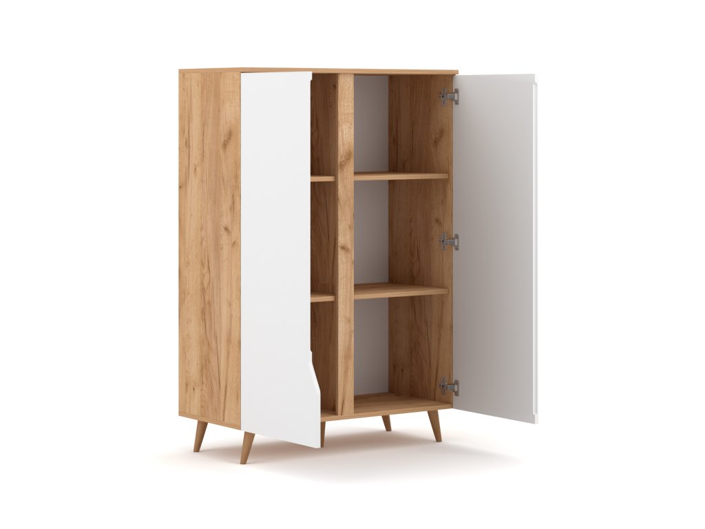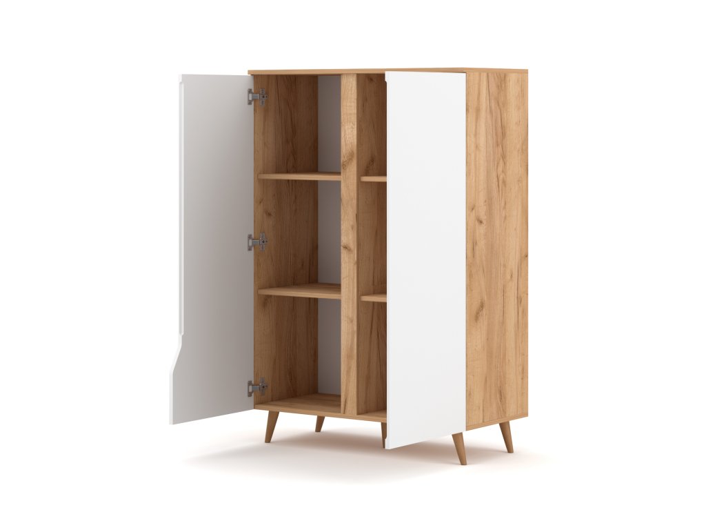 Komoda je vybavená jednou dvojdverovou časťou s dvoma policami vertikálne rozdelenými na ďalšie 2 časti. Celkovo vytvára 6 rovnako veľkých okien. Okraje sú zabezpečené hranami ABS, ktoré dodávajú estetický vzhľad a chránia pred mechanickým poškodením.