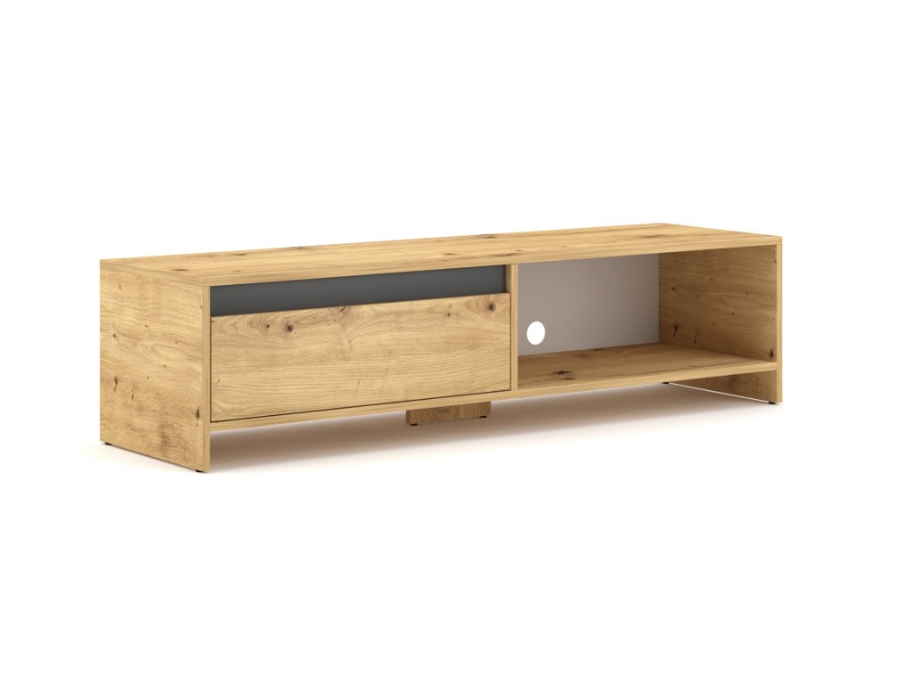 Vďaka jednoduchým tvarom sa hodí takmer do každej obývačky. Je symetricky rozdelená na otvorenú a uzavretú časť. V prvej z nich nájdu svoje miesto všetky zariadenia pracujúce s televízorom, zatiaľ čo za otváracími dverami môžete ukryť všetky predmety, ktoré nechcete nechať na očiach.