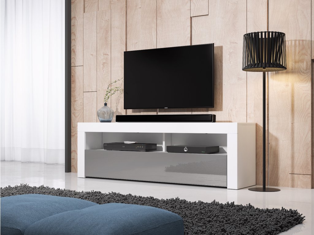Televízny stolík MEX 160 cm v kombinácii bielej a sivej farby je príkladom moderného dizajnu, ktorý sa dokonale hodí do modernej obývačky.