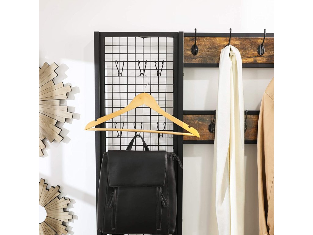Ak vám nestačí dobrý vzhľad, možno vás presvedčí množstvo háčikov na tomto regáli. Bundy môžete zavesiť na 9 pevných háčikov alebo využiť 6 pohyblivých háčikov na zavesenie šatiek, tašiek alebo iných doplnkov na praktickú mriežku.